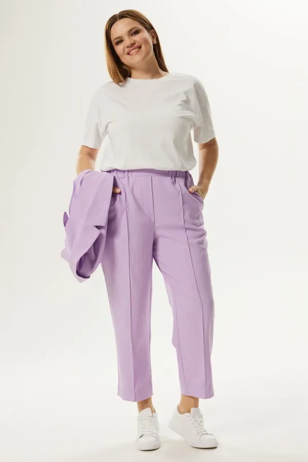 Брюки 7/8, зауженные книзу. Пояс притачной с резинкой, спереди декоративный гульфик-обманка. Передние части брюк с застроченными стрелками. Карманы фигурные боковые, функциональные.