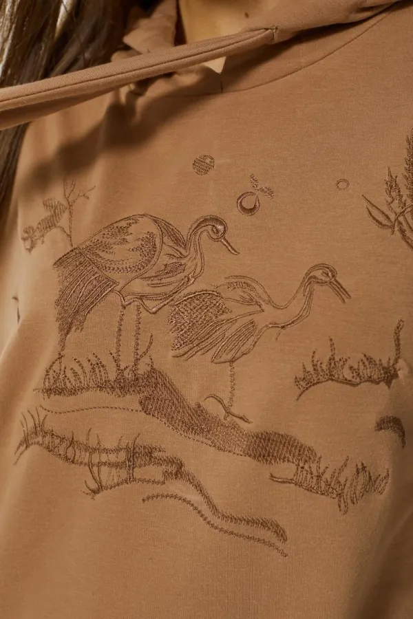 Худи с капюшоном с завязками из основной ткани, на полочке на груди дизайнерская вышивка аисты. Спинка цельная. Рукав длинный со спущенным плечом, одношовный. По низу изделия и рукавов идет широкая подгибка.