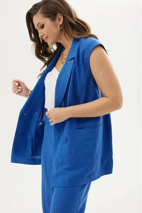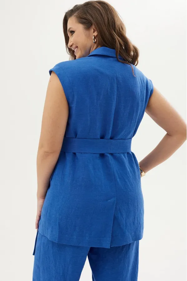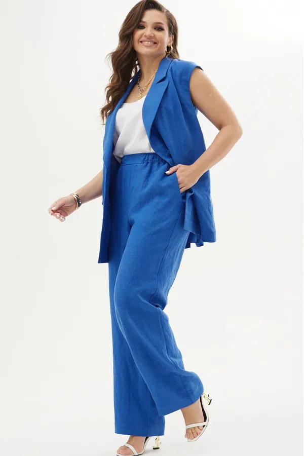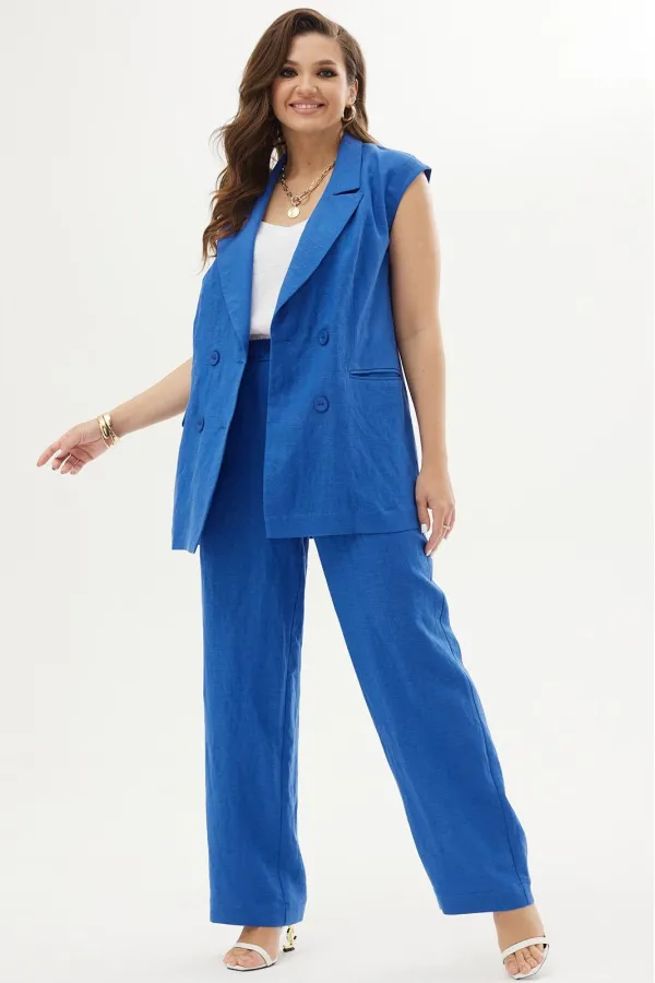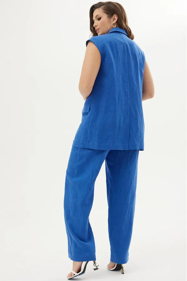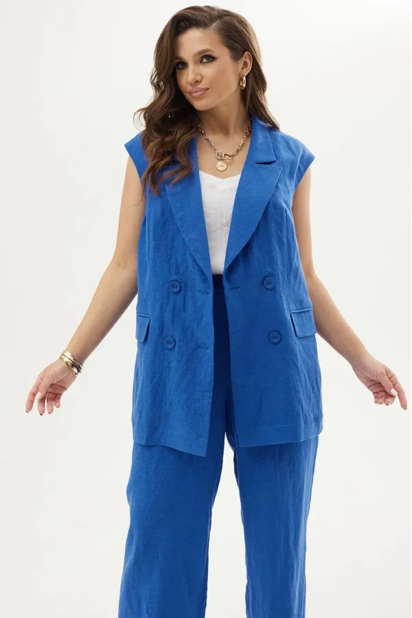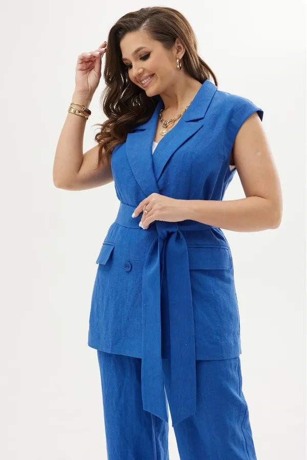 Костюм льняной 2-х предметный, состоящий из жилета и брюк. Жилет прямого силуэта без подклажки, на центральной двубортной застежке на петли и пуговицы. Перед с талиевыми вытачками и прорезными карманами в рамку с клапанами. Спинка со средним швом, внизу которого шлица. Воротник стояче-отложной с лацканами. Жилет удлиненный, в комплекте идет съемный пояс из основной ткани. Брюки прямые, Брюки прямые. С карманом с отрезным бочком. Пояс на резинке и декоративным гульфиком без кулисы.
