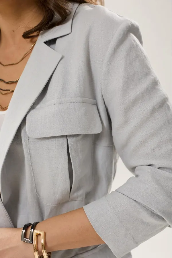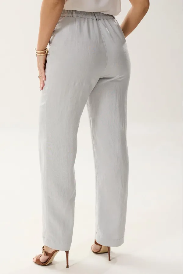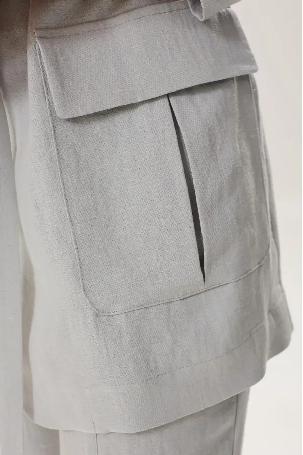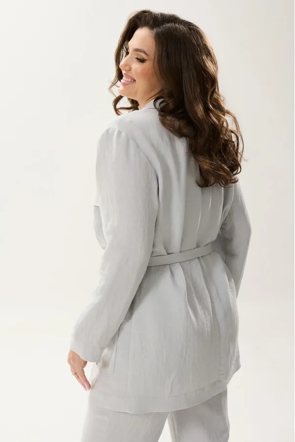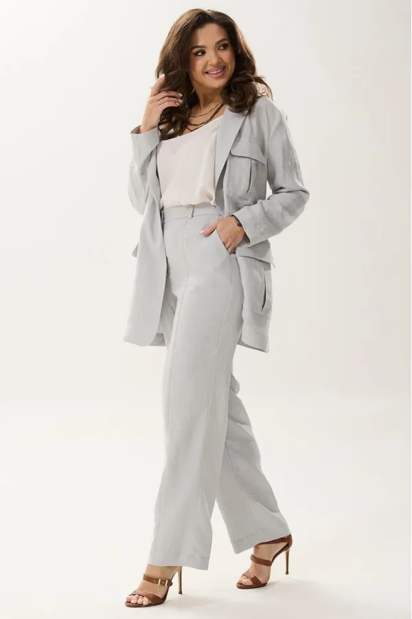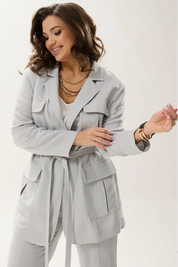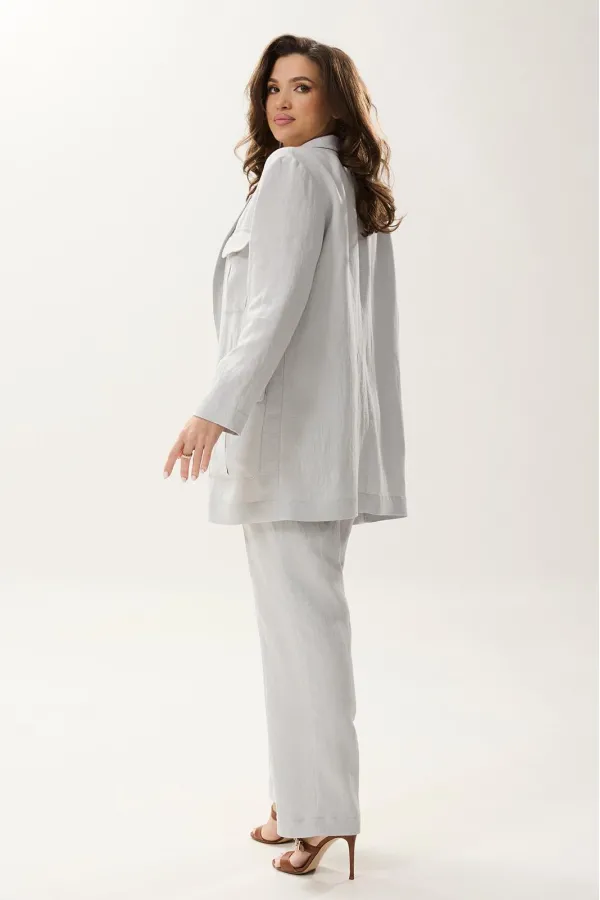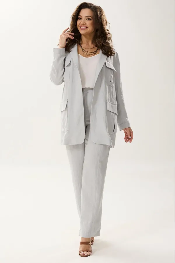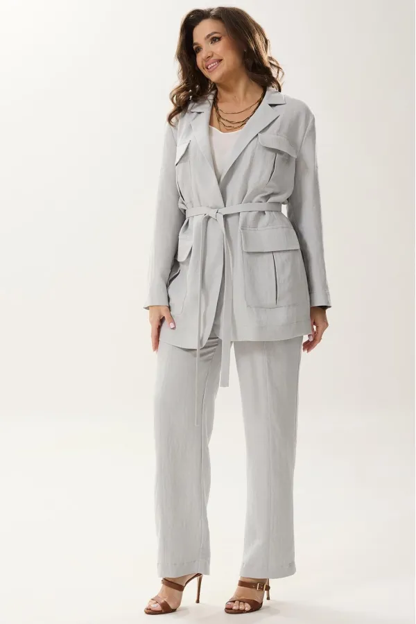 Комплект женский, состоящий из жакета и брюк. Жакет полуприлегающего силуэта, рукав длинный втачной, спинка со средним швом. По переду накладные карманы со складкой и клапаном. Пояс в комплекте. Брюки прямые на резинке по спинке, по переду рельефы, на задней половине вытачки. Застежка на молнию и пуговицы.