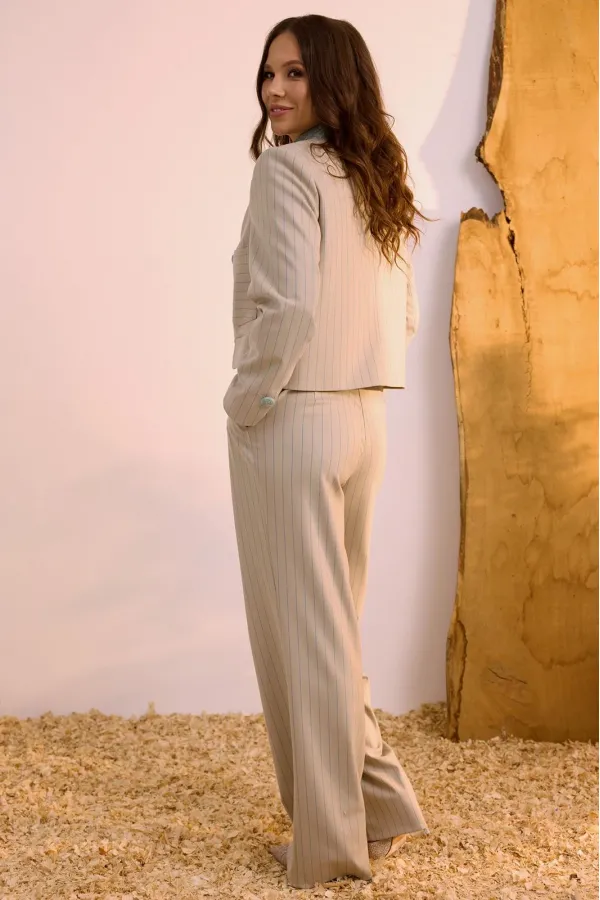 Стильный комплект из жакета и брюк. Жакет двубортный прямого кроя, на подкладке, слегка укорочен. Классический воротник и застежка на пуговицы создают стильный и универсальный силуэт, который легко комбинируется как с брюками прямого кроя , так и с юбкой. Рукав втачной. Жакет дополнен отделкой из рогожки бирюзового цвета, что придает образу уникальность. Брюки прямого кроя с притачным поясом, дополненным эластичной тесьмой. Посадка средняя. Застежка гульфик на молнию и пуговицу. Дополнены функциональными боковыми карманами. Длина жакета от плечевого шва 57 см. Длина рукава 60 см. Длина брюк по боковому шву 104 см.
