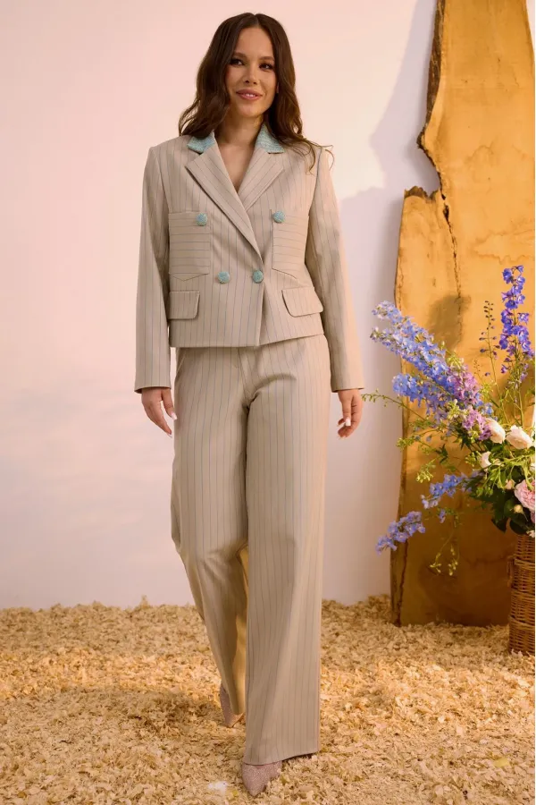 Стильный комплект из жакета и брюк. Жакет двубортный прямого кроя, на подкладке, слегка укорочен. Классический воротник и застежка на пуговицы создают стильный и универсальный силуэт, который легко комбинируется как с бр... Читать далее...