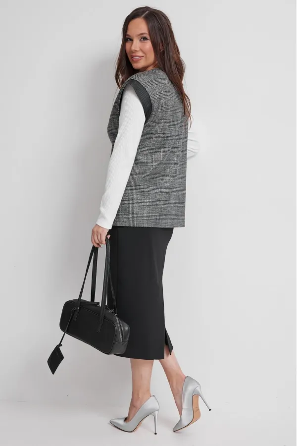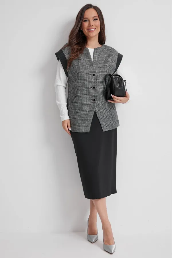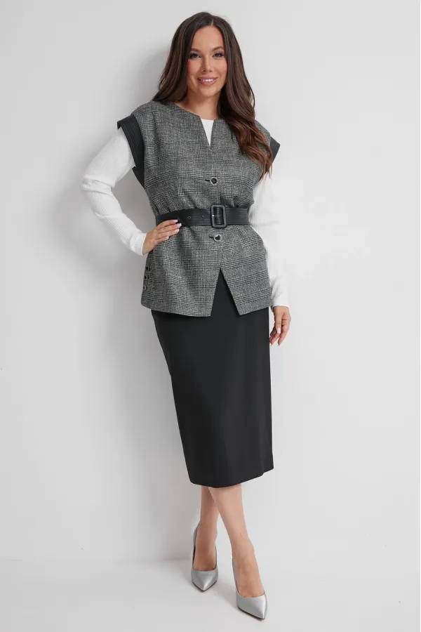 Элегантный комплект из жилета, лонгслива и юбки. Удлиненный жилет свободного прямого кроя, на подкладке, с центральной застежкой на пришивные пуговицы. Дополнен удобными карманами и съемным красивым поясом. Жилет выполне... Читать далее...