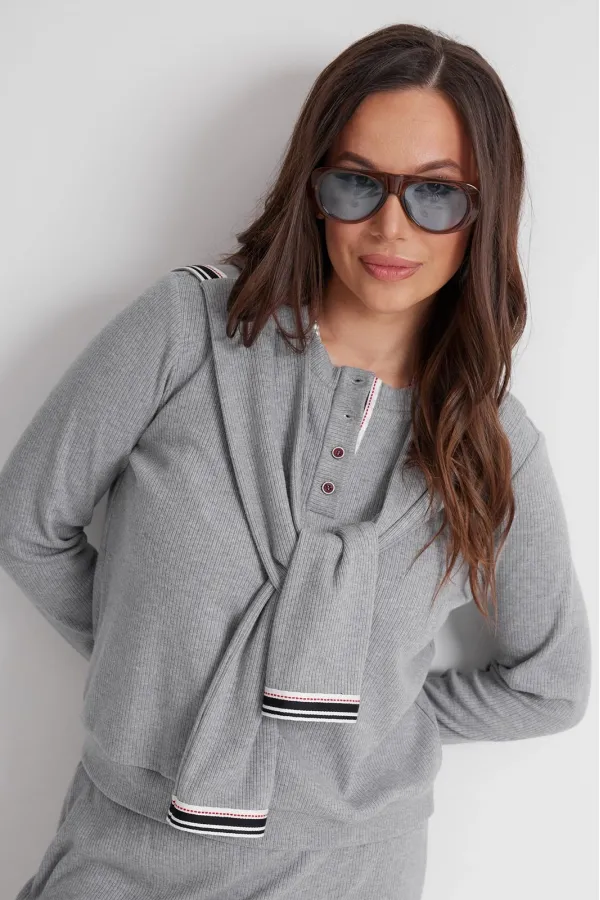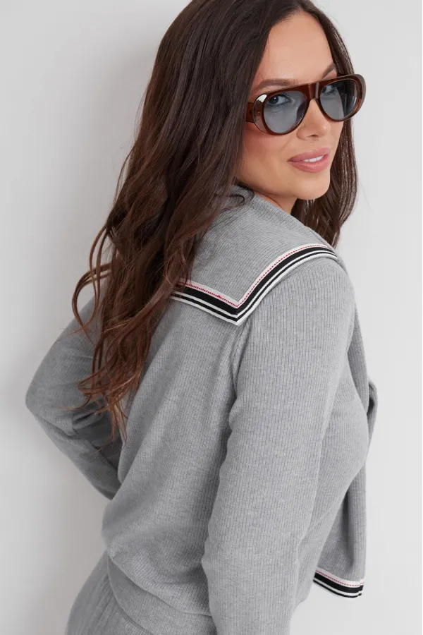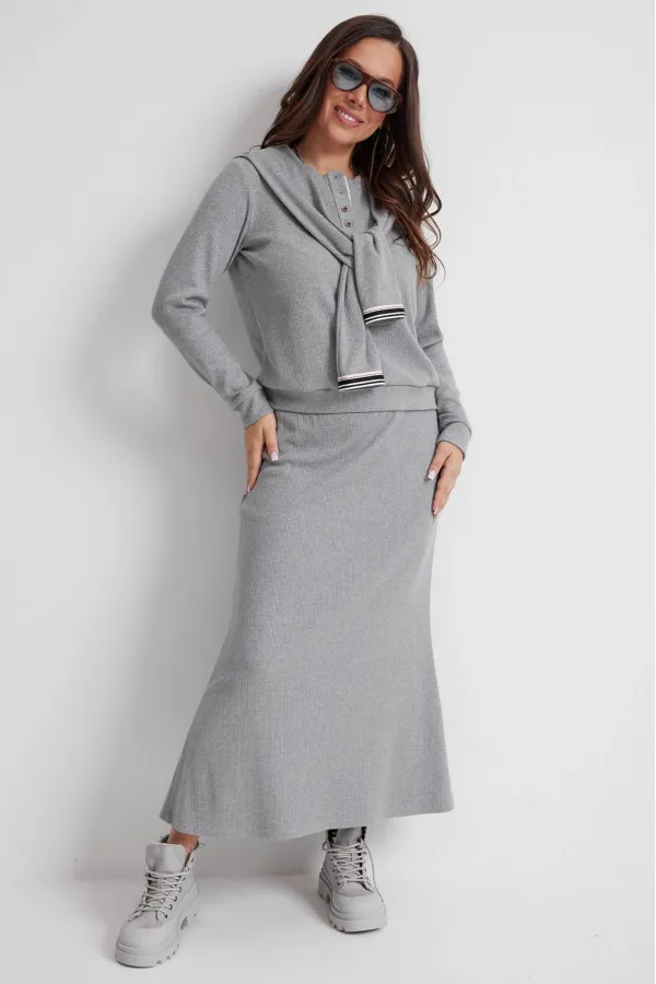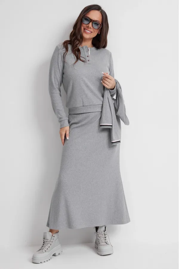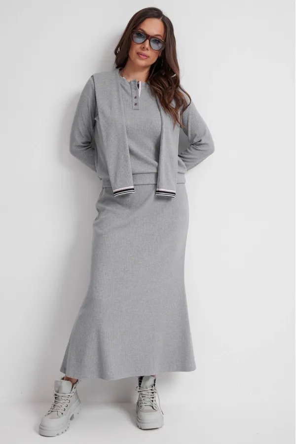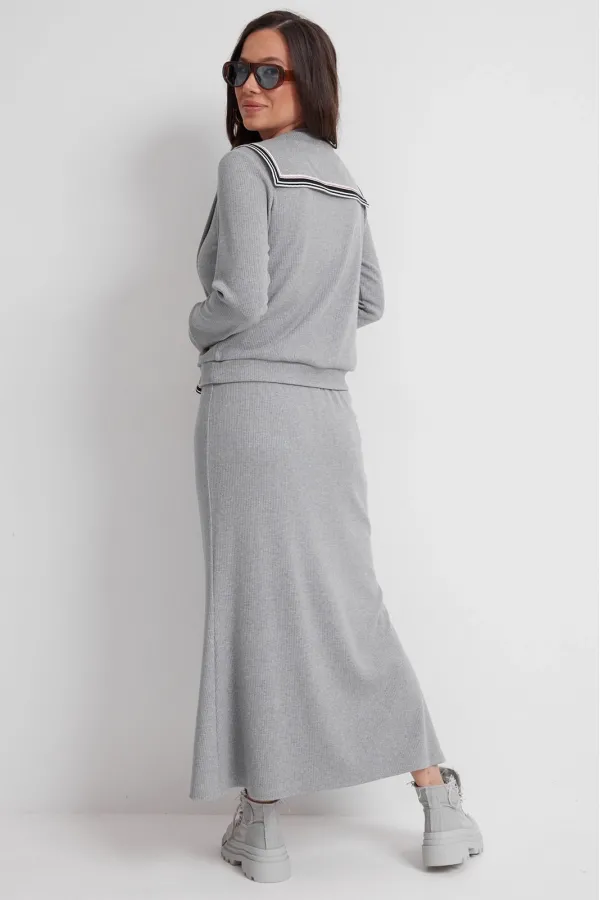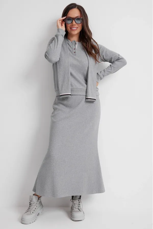 Стильный трикотажный комплект из джемпера и юбки. Выполнен из приятного к телу трикотажного полотна средней плотности в рубчик. Джемпер свободного прямого кроя с длинным втачным рукавом, дополненным притачной манжетой. Горловина округлой формы с планкой на застежке(пуговицы). Низ слегка присборен притачным поясом. Изюминкой является съемный (на потайных кнопках) воротник с имитацией рукавов. Юбка макси с притачным поясом, дополненным эластичной тесьмой. Крой юбки прямой с легким клешением к низу. Длина джемпера от плечевого шва 63см. Длина рукава 60см. Длина юбки 90 см.