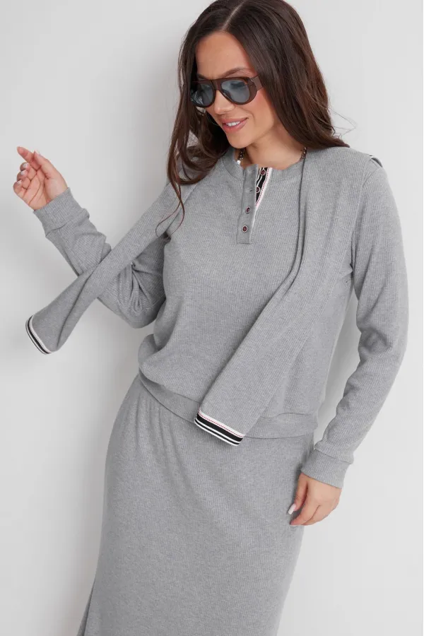 Стильный трикотажный комплект из джемпера и юбки. Выполнен из приятного к телу трикотажного полотна средней плотности в рубчик. Джемпер свободного прямого кроя с длинным втачным рукавом, дополненным притачной манжетой. Г... Читать далее...