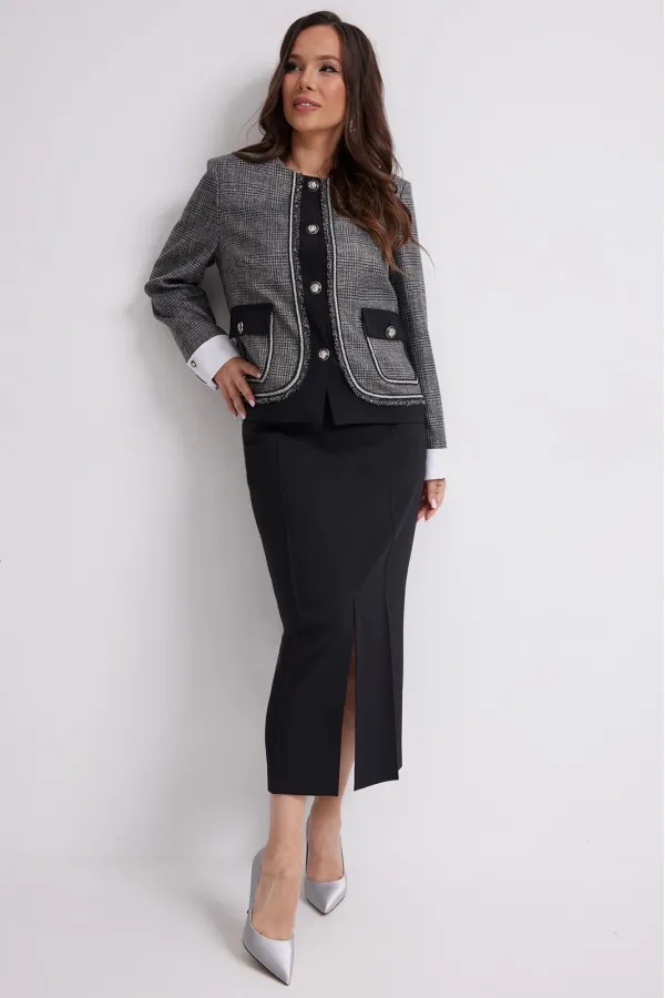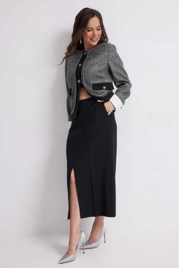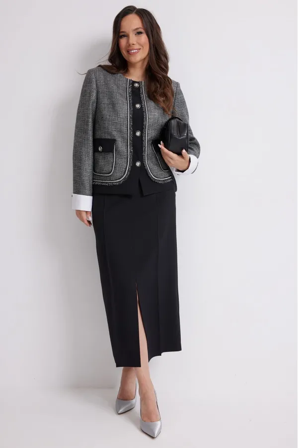 Стильный комплект из жакета и брюк. Жакет прямого кроя, на подкладке, с центральной застежкой на красивые пришивные пуговицы. Рукав втачной, дополнен съемными белыми манжетами. Выполнен жакет из красивой костюмной ткани. Юбка миди прямого кроя, на подкладке, с удобным разрезом спереди. Дополнена удобными боковыми и накладными задними карманами. Юбка с притачным поясом со шлевками для ремня, с застежкой по спинке на потайную молнию и пуговицу. Длина жакета от плечевого шва 60см. Длина рукава 60см. Длина юбки 83см.
