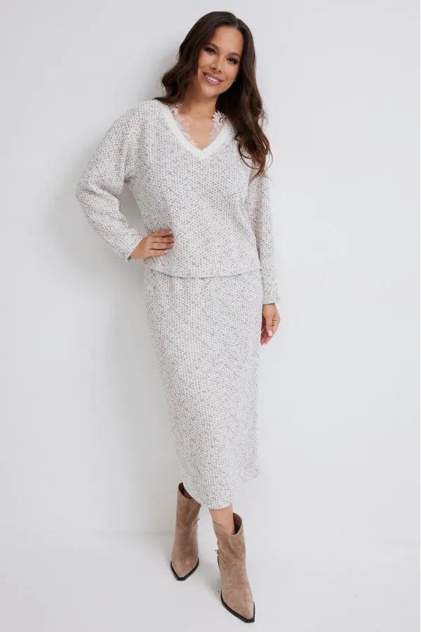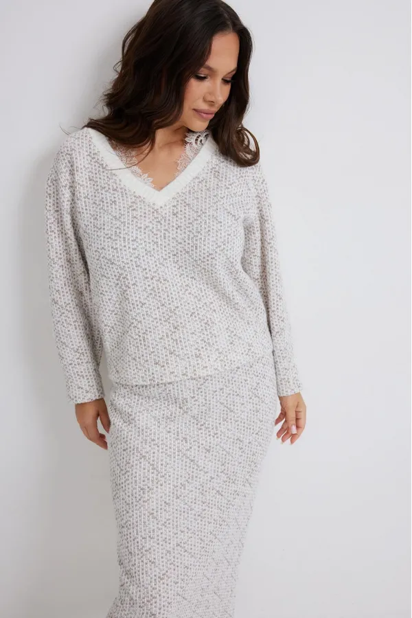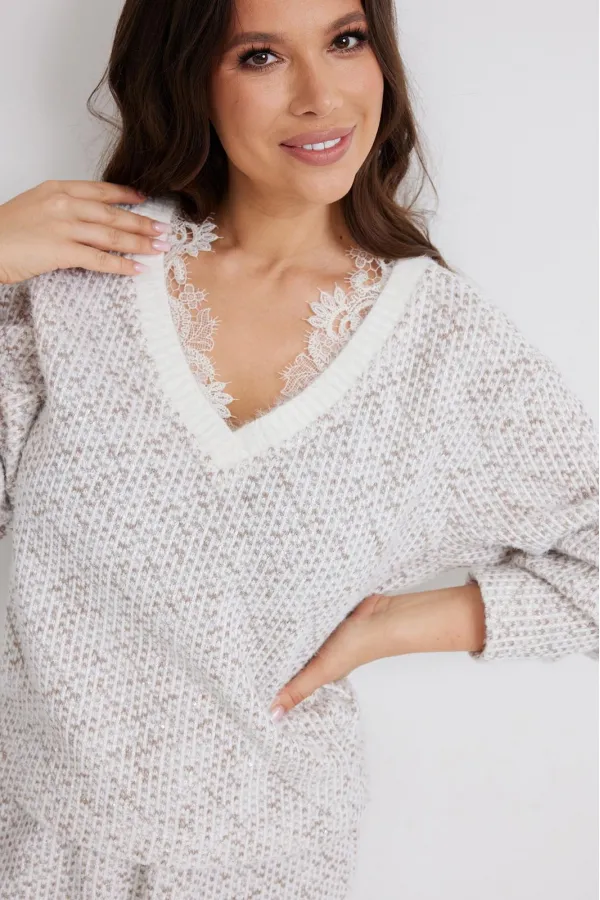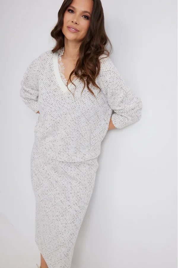 Элегантный и нежный комплект из джемпера и юбки, выполненных из вязаного, слегка пушистого трикотажного полотна с россыпью мелких , слегка мерцающих пришивных пайеток. Джемпер свободного кроя со спущенной линией плеча. Горловина с V- образным вырезом, дополненным нежным кружевом. Юбка прямого классического кроя с притачным поясом, дополненным эластичной тесьмой. Юбка на комфортной трикотажной подкладке. Длина джемпера от плечевого шва 64см. Длина рукава 60 см. Длина юбки по боковому шву 79 см.