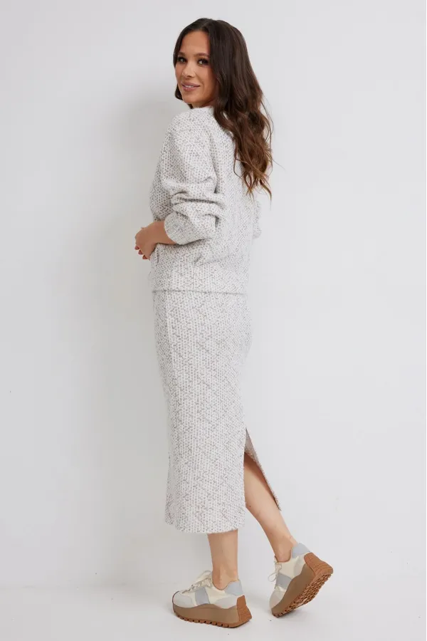 Элегантный и нежный комплект из джемпера и юбки, выполненных из вязаного, слегка пушистого трикотажного полотна с россыпью мелких , слегка мерцающих пришивных пайеток. Джемпер свободного кроя со спущенной линией плеча. Г... Читать далее...