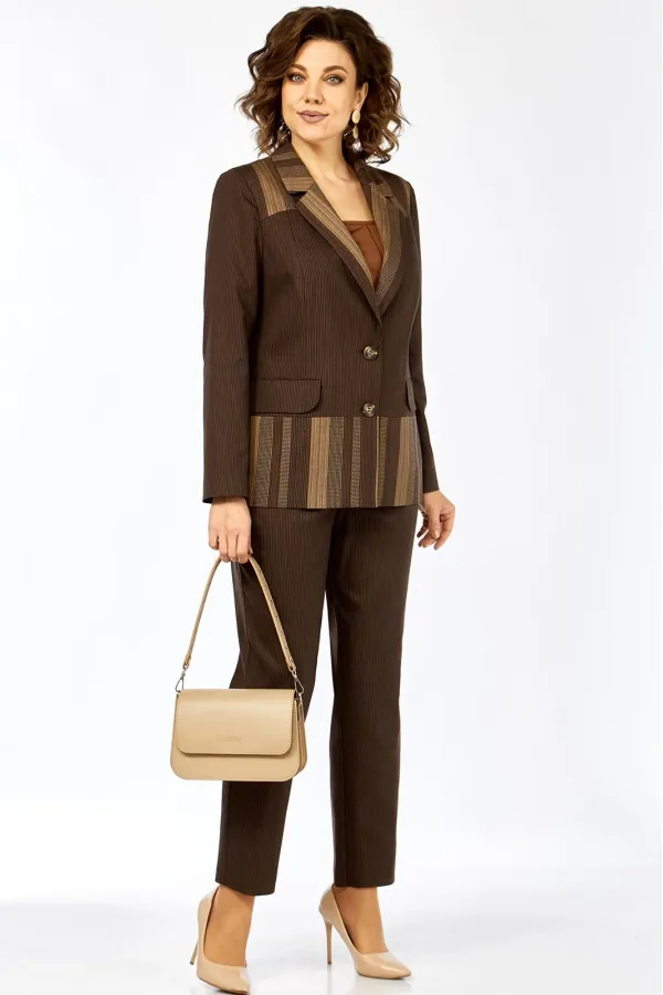 Комплект женский 2-х предметный, состоящий из жакета и брюк. Жакет на подкладке, с центальной застежкой на 2 пуговицы, воротником пиджачного типа. Перед с отрезными кокетками, отрезной баской и рельефами от кокетки до баски переда. По переду имеются прорезные карманы с клапанами. Спинка с кокеткой, баской по низу и средним швом от кокетки до баски. Рукав втачной, двухшовный. Брюки слегка заужены к низу. Имеются карманы-хулиганы в боковых швах. Брюки на отрезном поясе, пояс по спинке и частично по переду на резинке.
