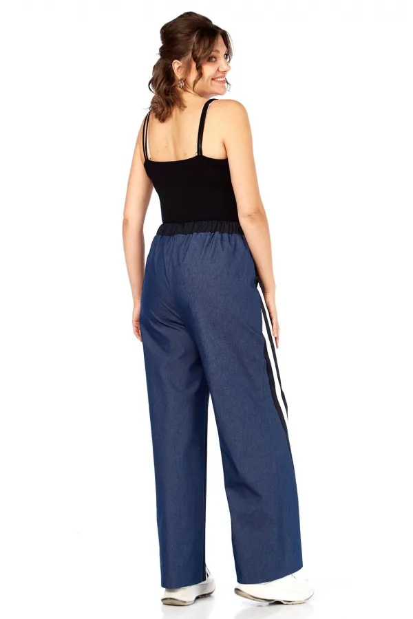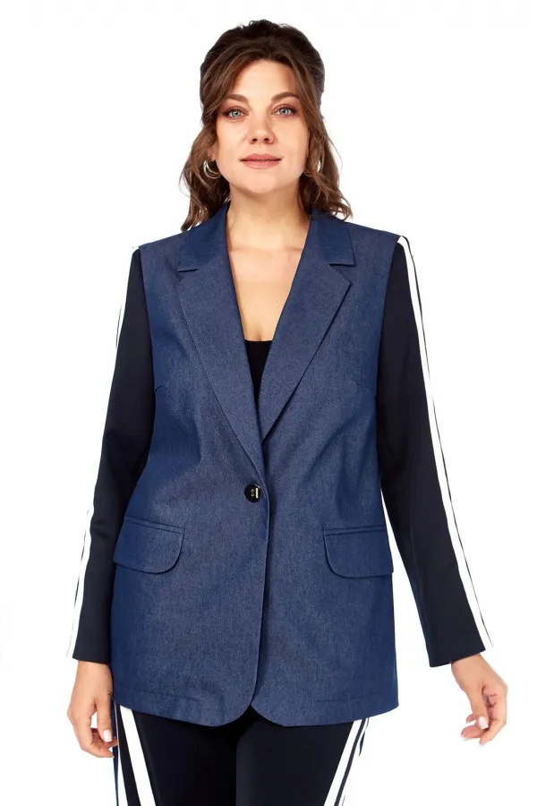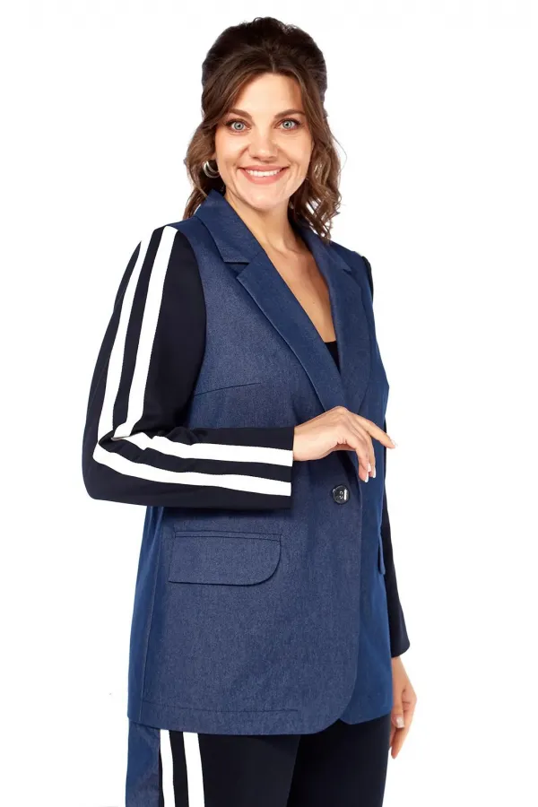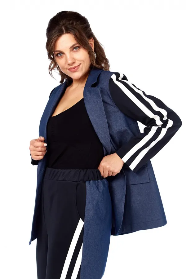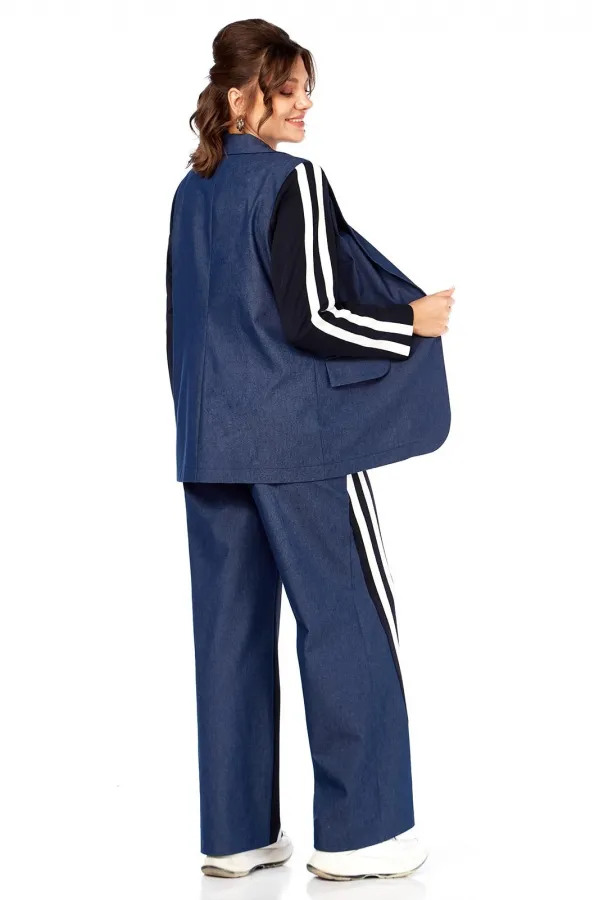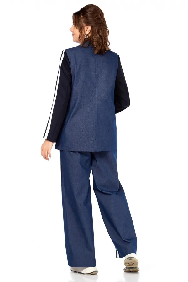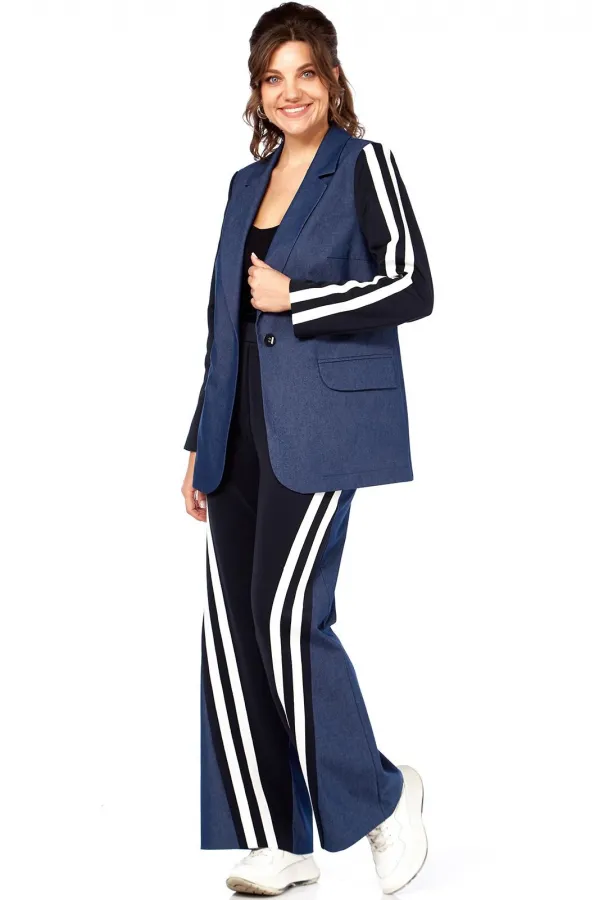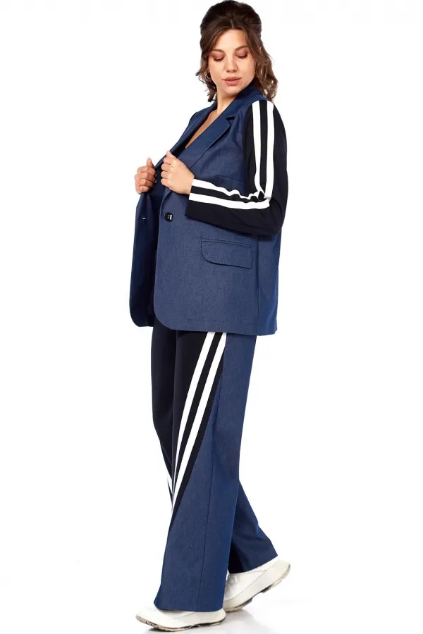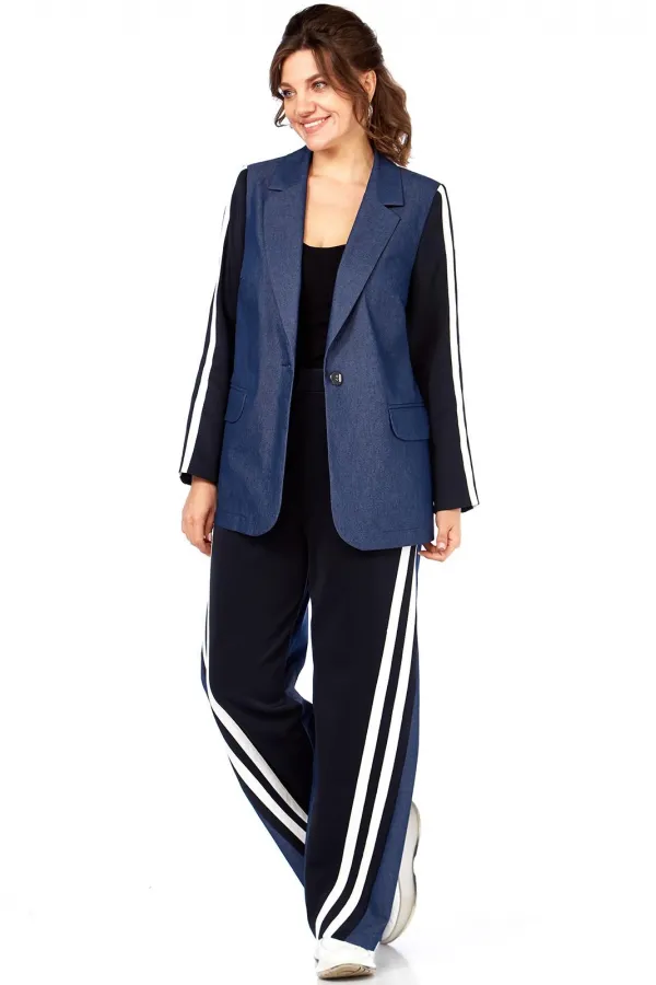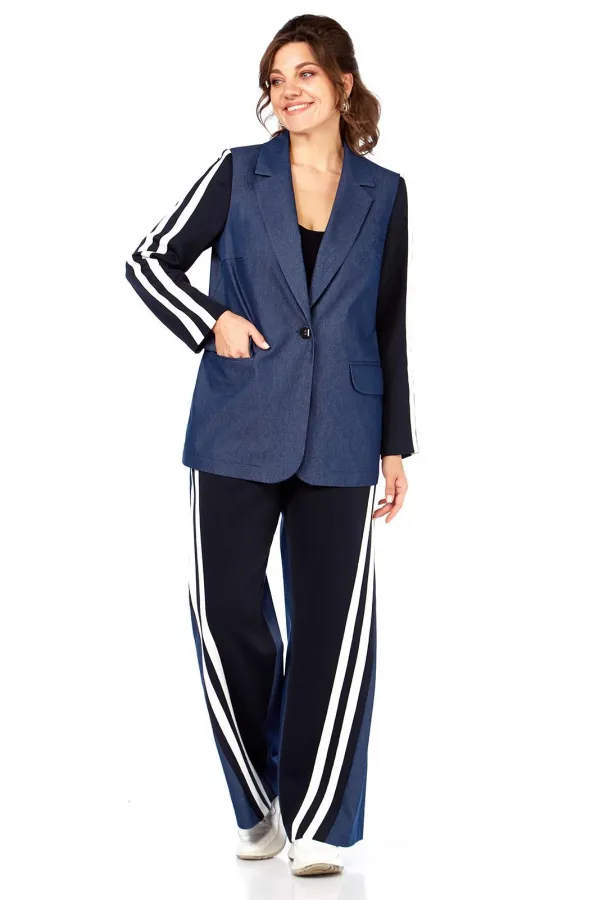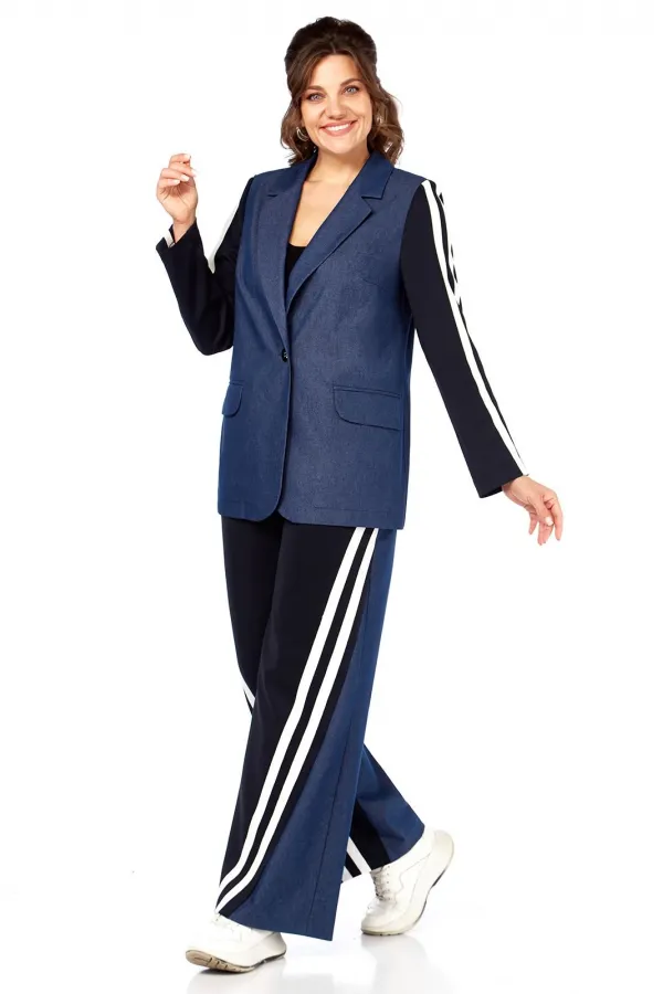 Комплект женский 2-х предметный: жакет и брюки. Жакет прямого силуэта, без подкладки, с центральной застежкой на петли-пуговицы. По переду на уровне талии выполнены прорезные карманы с клапаном и рамкой. Рукав втачной двухшовный с лампасами от плеча до низа рукава, рукав из трикотажной ткани. Спинка со средним швом. Брюки на круговой резинке, широкого кроя, с карманами в боковых швах и лампасами по переду от карманов до низа изделия. Перед и пояс из трикотажной ткани.