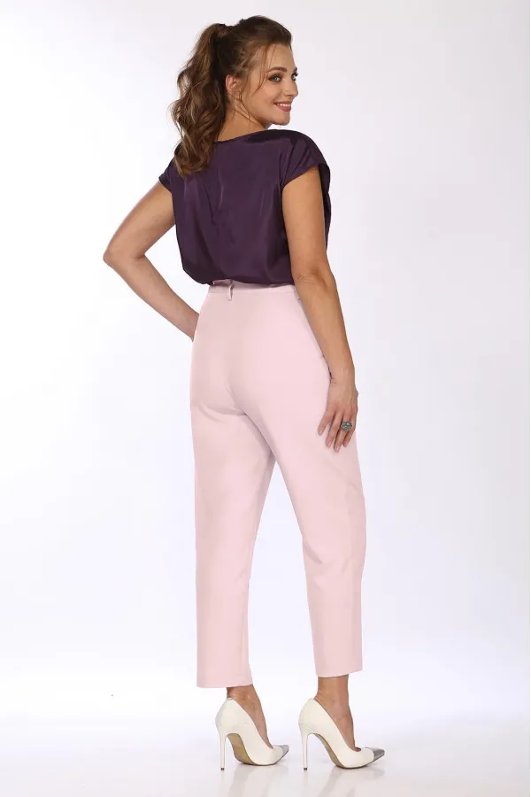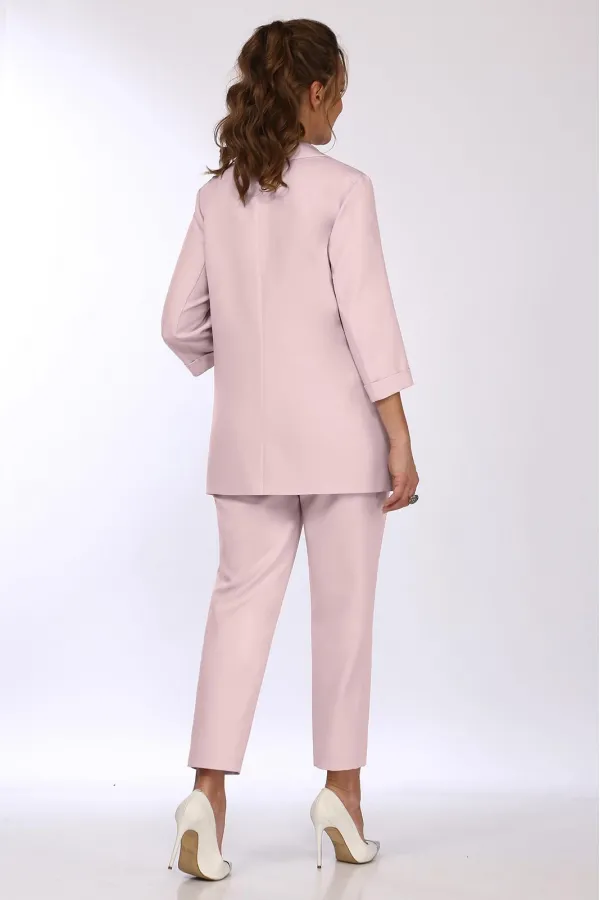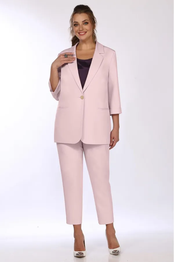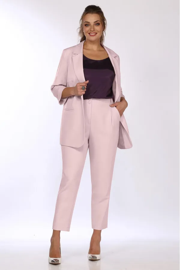Комплект женский 3-х предметный состоящий из жакета, брюк, блузки. Жакет прямого силуэта, на подкладке с центральной застежкой на петли-пуговицы. По переду на уровне талии выполнены прорезные карманы с листочкой. Рукав втачной, двухшовный с цельнокроеной манжетой. Брюки прямые, слегка заужены к низу. По переду выполнены боковые карманы. Пояс брюк на резинке. Блузка прямого силуэта, вырез горловины круглый, линия плеча спущена.