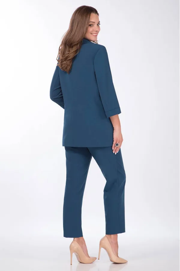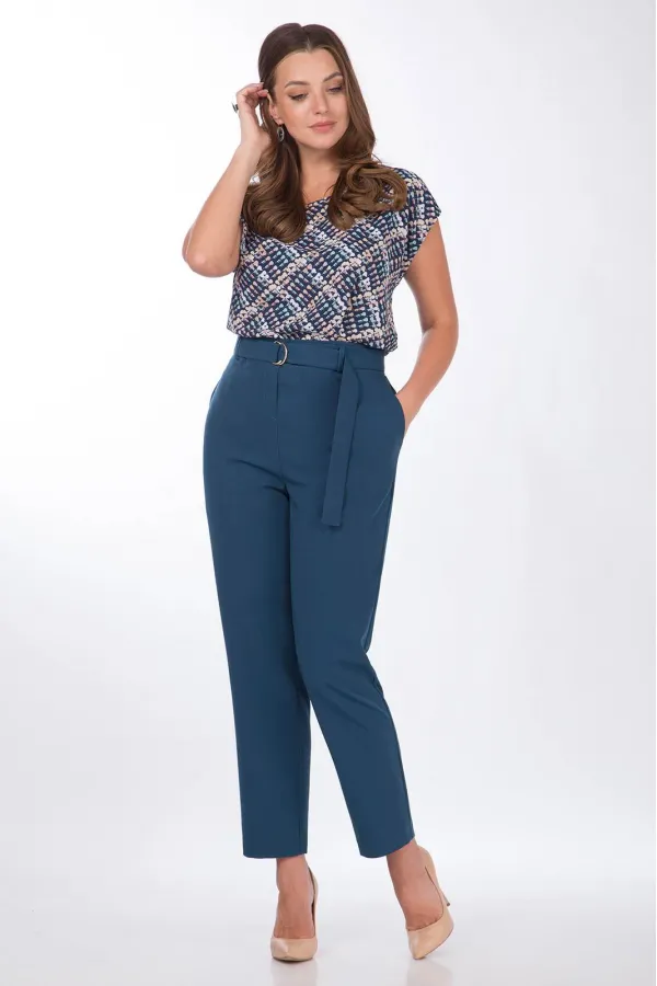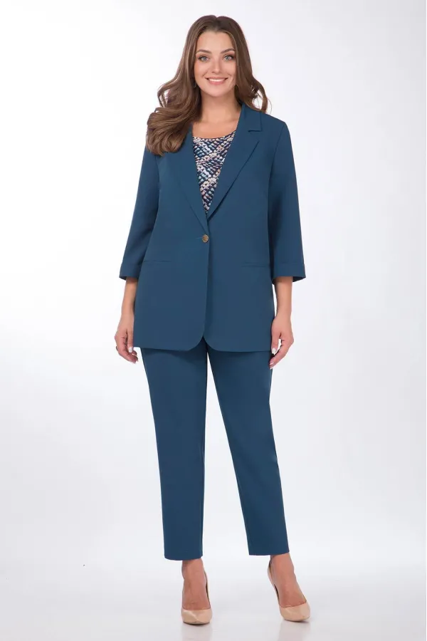 Комплект женский 3-х предметный состоящий из жакета,брюк, блузки. Брошь в комплекте. Жакет прямого силуэта, на подкладке с центральной застежкой на петли-пуговицы. По переду на уровне талии выполнены прорезные карманы с листочкой. Рукав втачной, двухшовный с цельнокроеной манжетой. Брюки прямые,слегка заужены к низу. По переду выполнены боковые карманы. Пояс брюк на резинке. К брюкам прилагается съемный пояс из основной ткани. Блузка прямого силуэта,вырез горловины круглый,линия плеча спущена.