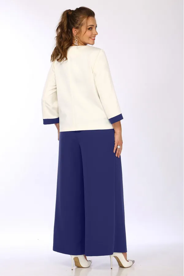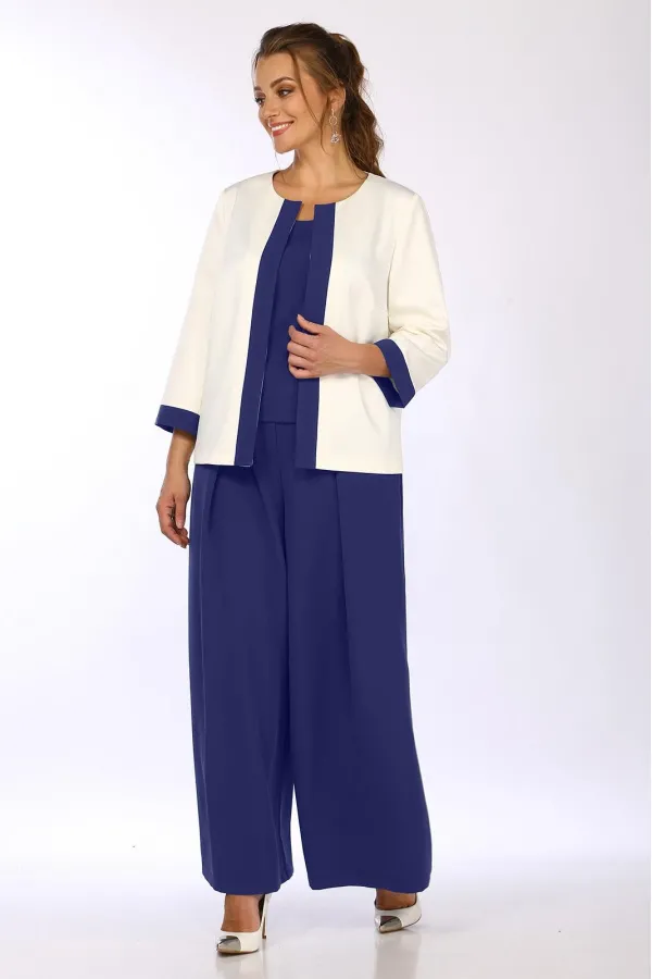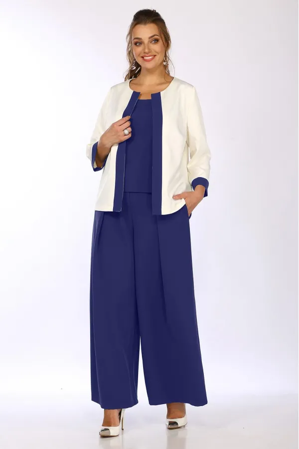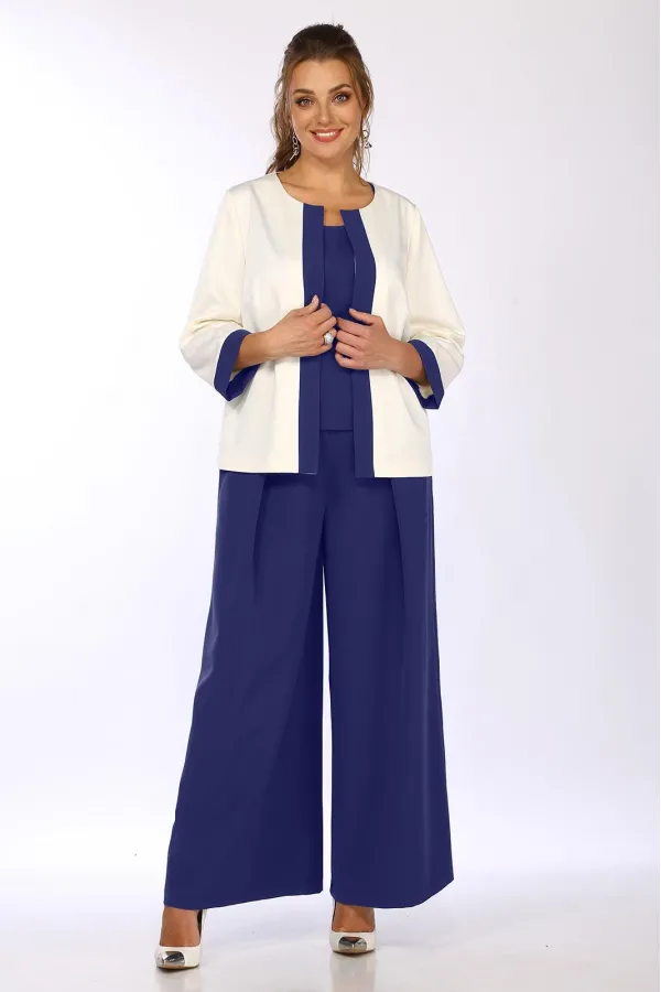 Комплект женский 3-х предметный, состоящий из брюк-палаццо, жакета и блузки. Блузка прилегающего силуэта, на широких бретелях, с квадратным вырезом горловины, с рельефами от углов горловины и до низа изделия. потайная тесьма-молния в боковом шве. Спинка с талиевыми вытачками. Пройма окантована. Брюки-палаццо, с карманами в боковых швах, с застежкой-молнией и 2 пуговицами. В пояс брюк частично вставлена резинка. Брюки со складками по переду Жакет без застежки, с отрезной планкой. Перед с вытачками из боковых швов. Спинка со средним швом. Рукав втачной, двухшовный, длиной 3/4, с отрезной манжетой.