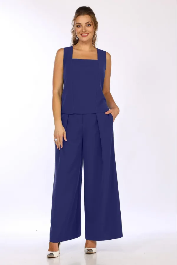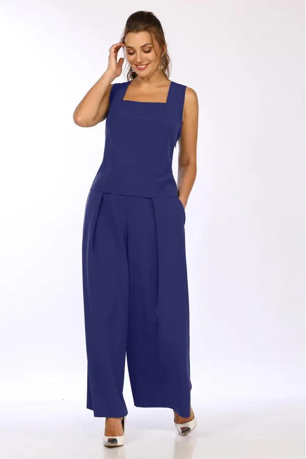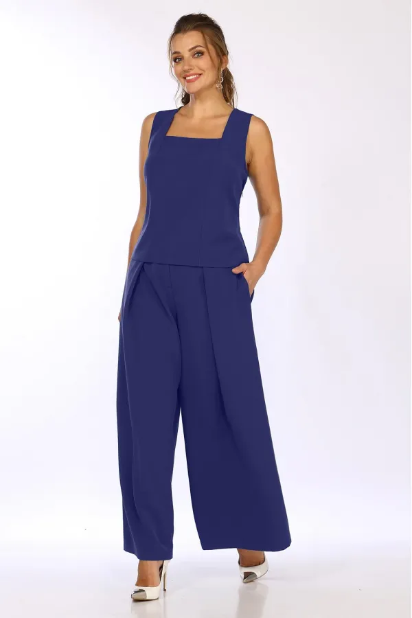 Комплект женский 3-х предметный, состоящий из брюк-палаццо, жакета и блузки. Блузка прилегающего силуэта, на широких бретелях, с квадратным вырезом горловины, с рельефами от углов горловины и до низа изделия. потайная те... Читать далее...