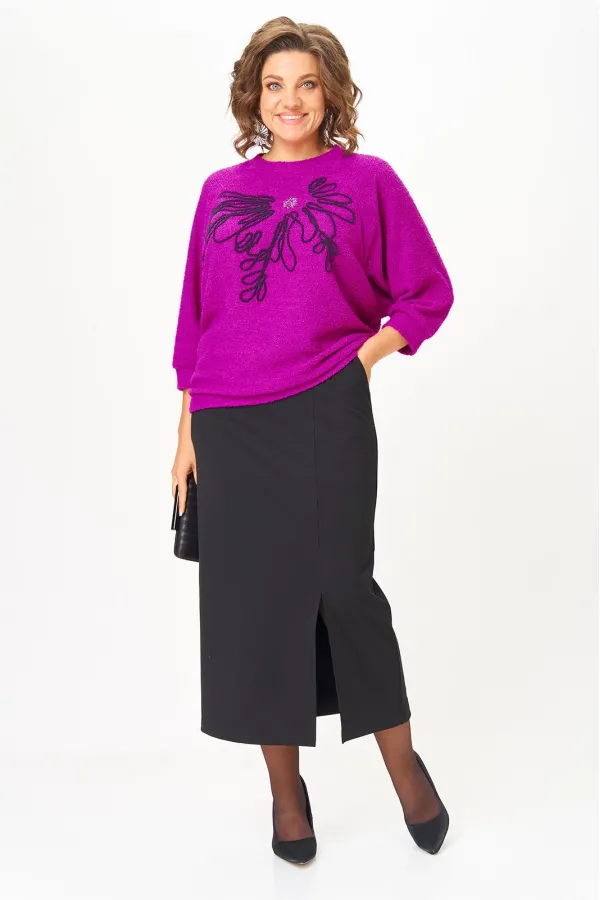 Универсальный и удобный женский юбочный комплект. Данный комплект отличный вариант как для повседневной носки, так и для торжеств. Изделие состоит из джемпера и длинной юбки. Джемпер свободного кроя выполнен из плотного трикотажа. По переду украшен вышивкой, благодаря чему изделие смотрится нарядно. Горловина круглая, рукав реглан летучая мышь. Низ и рукава на манжете из основной ткани. Прямая удлиненная юбка с декоративной молнией по переду. Изделие на притачном поясе с резинкой и двумя функциональными карманами в боковых швах. Благодаря своей универсальности этот комплект займет важное место в вашем осенне-зимнем гардеробе. Длина джемпера по спинке 65 см (±1 см), длина рукава от горловины 62 см. Длина юбки по боковому шву 92 см.