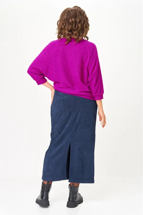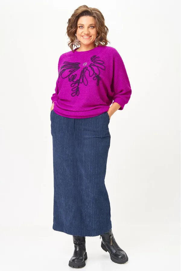 Этот элегантный и модный комплект станет ярким акцентом в вашем гардеробе! Комплект включает в себя яркий пурпурный джемпер с рукавами реглан «летучая мышь» и изящную юбку в темно-синих тонах, выполненную из мягкого, приятного к телу вельвета.
