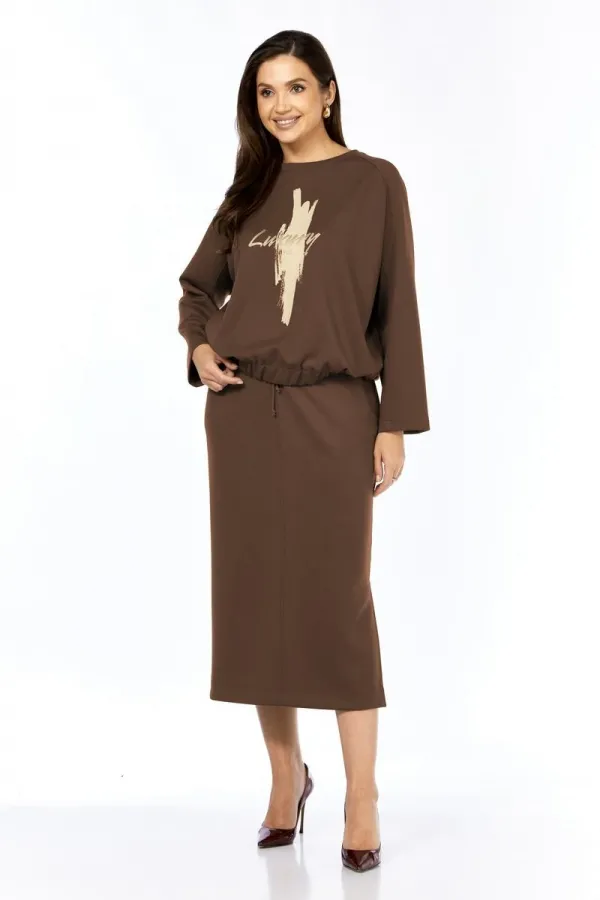 Костюм женский, состоящий из джемпера и юбки, выполнен в спортивном стиле из трикотажа. Джемпер свободного силуэта, по низу переда присборен на широкую манжету на резинке. Спинка прямая, удлинена на 4 см, рукав реглан, перед джемпера оформлен печатью, горловина круглая, оформлена бейкой. Юбка, прямого силуэта с поясом на резинке и разрезом сбоку, пояс оформлен декоративным шнуром с наконечниками, в боковых швах - карманы.