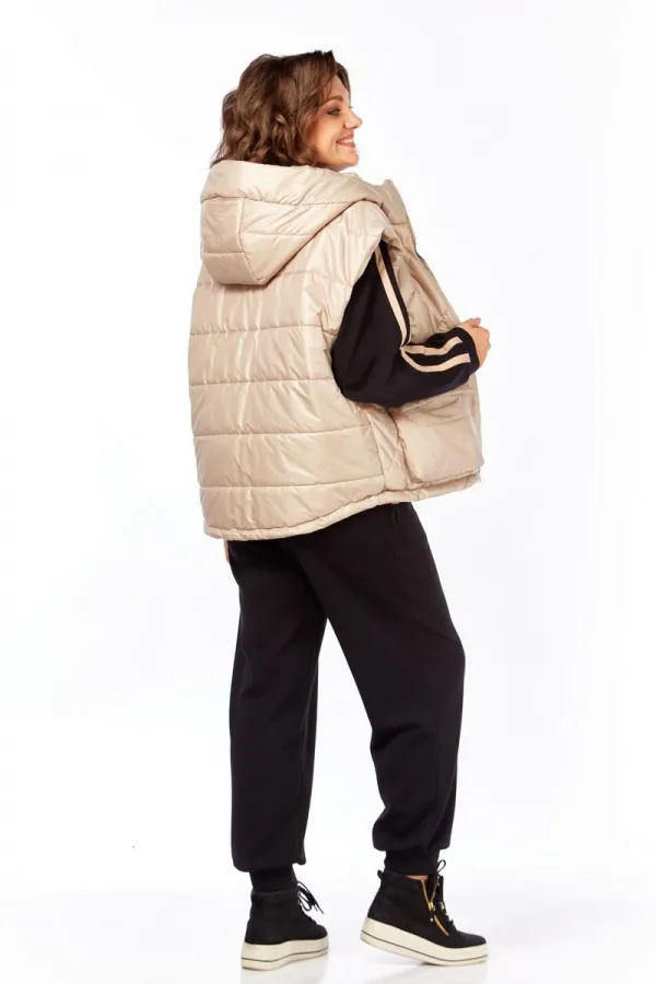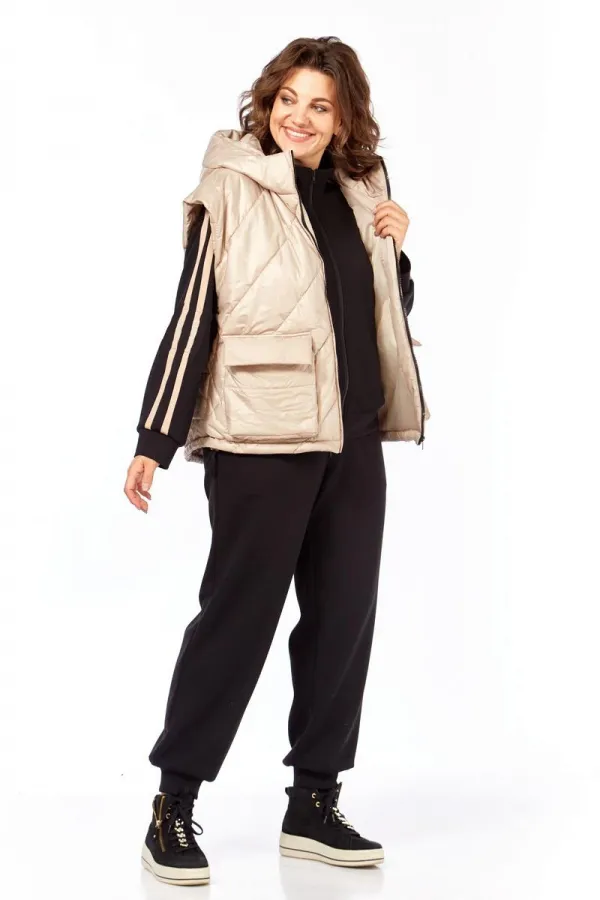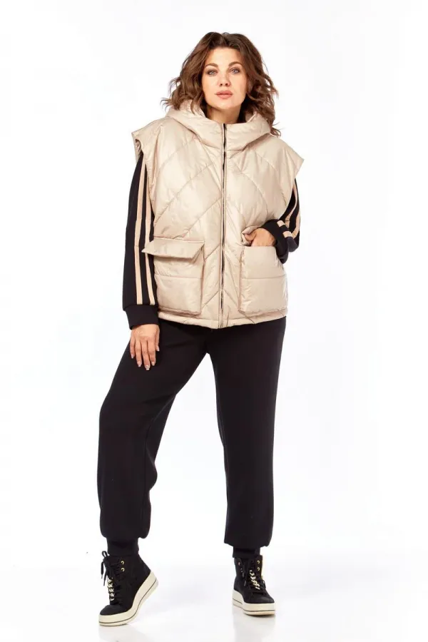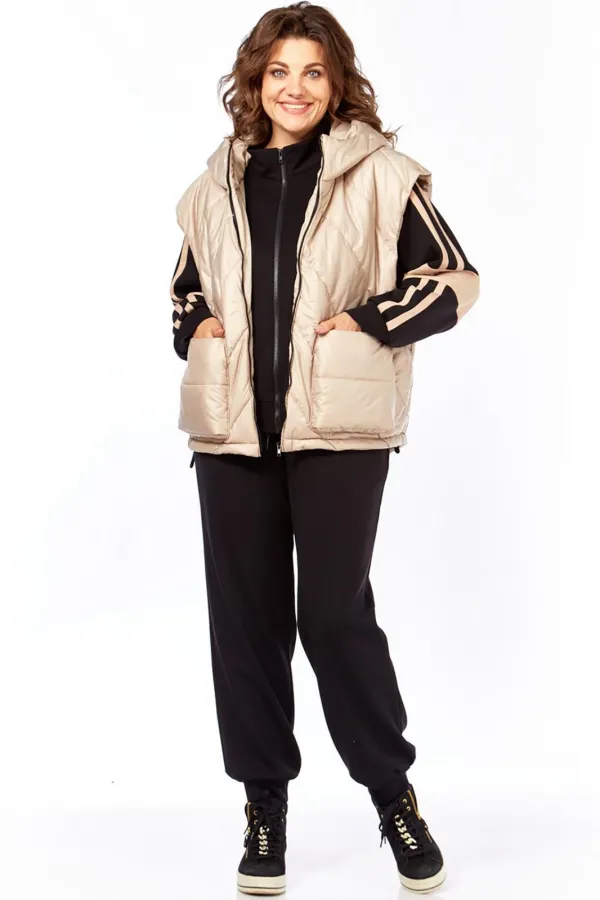 Комплект женский в спортивном стиле, состоящий из жилета, олимпийки и брюк. Жилет из стеганой плащевки с синтепоновым наполнителем, свободного силуэта, до бедра, сзади удлиненный. Имеет капюшон, застегивается на тесьму-молнию, по низу – кулиска (шнур с фиксатором) для регулировки прилегания. На передней половинке – накладные карманы с клапаном.