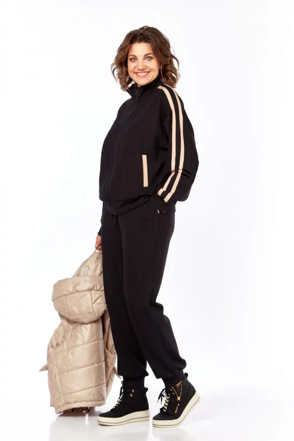 Олимпийка и спортивные брюки выполнены из плотного трикотажа. Олимпийка с воротником-стойкой, спереди застегивается на молнию, на передней половинке - прорезные карманы с акцентными листочками. Рукава на спущенной пройме, с лампасами. Заканчивается рукав манжетой из основной ткани.