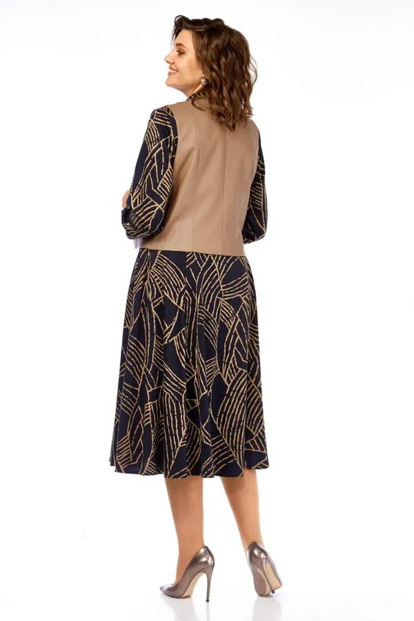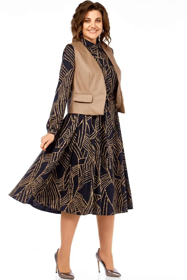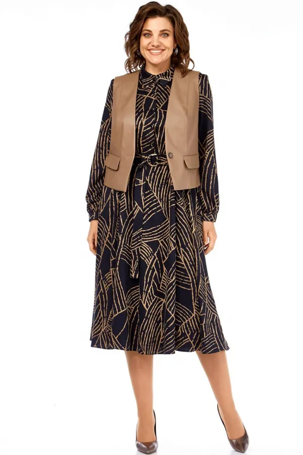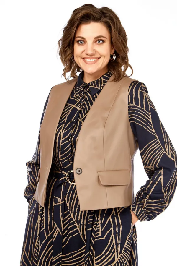 Комплект женский, состоящий из платья и жилета. Платье свободного силуэта, трикотажное, без подкладки. Рукав втачной, снизу собран на манжету, манжета застегивается на петлю и пуговицу. По талии платье отрезное, спереди до талии планка на петли и пуговицы и нагрудные вытачки, которые позволяют создать идеальную посадку по груди. Юбка-шестиклинка. Дополнительно в комплекте к платью присутствует пояс из основной ткани. Жилет полуприлегающего силуэта из эко-кожи, с накладными декоративными клапанами, застежка на одну петлю и пуговицу.