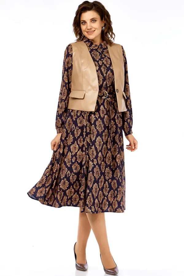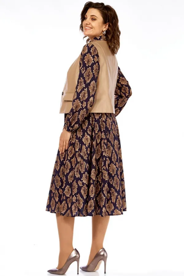 Комплект женский, состоящий из платья и жилета. Платье свободного силуэта, трикотажное, без подкладки. Рукав втачной, снизу собран на манжету, манжета застегивается на петлю и пуговицу. По талии платье отрезное, спереди до талии планка на петли и пуговицы и нагрудные вытачки, которые позволяют создать идеальную посадку по груди. Юбка-шестиклинка. Дополнительно в комплекте к платью присутствует пояс из основной ткани. Жилет полуприлегающего силуэта из эко-кожи, с накладными декоративными клапанами, застежка на одну петлю и пуговицу.