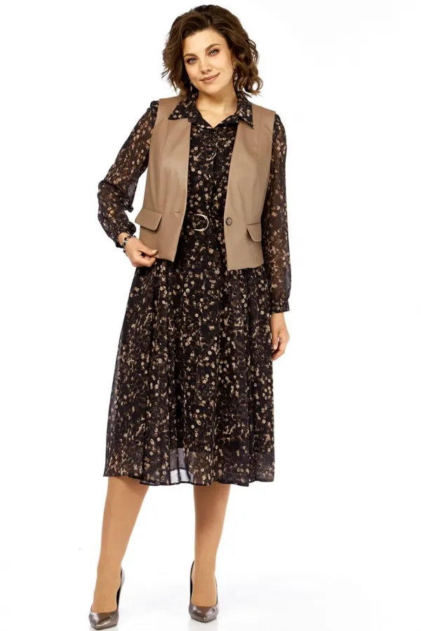 Комплект женский, состоящий из платья и жилета. Платье свободного силуэта, трикотажное, без подкладки. Рукав втачной, снизу собран на манжету, манжета застегивается на петлю и пуговицу. По талии платье отрезное, спереди до талии планка на петли и пуговицы и нагрудные вытачки, которые позволяют создать идеальную посадку по груди. Юбка-шестиклинка. Дополнительно в комплекте к платью присутствует пояс из основной ткани. Жилет полуприлегающего силуэта из эко-кожи, с накладными декоративными клапанами, застежка на одну петлю и пуговицу.