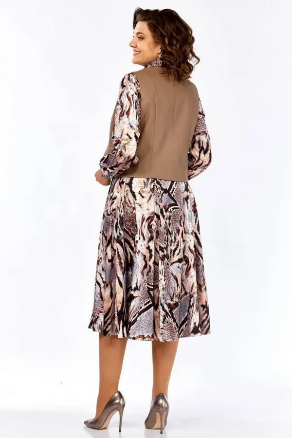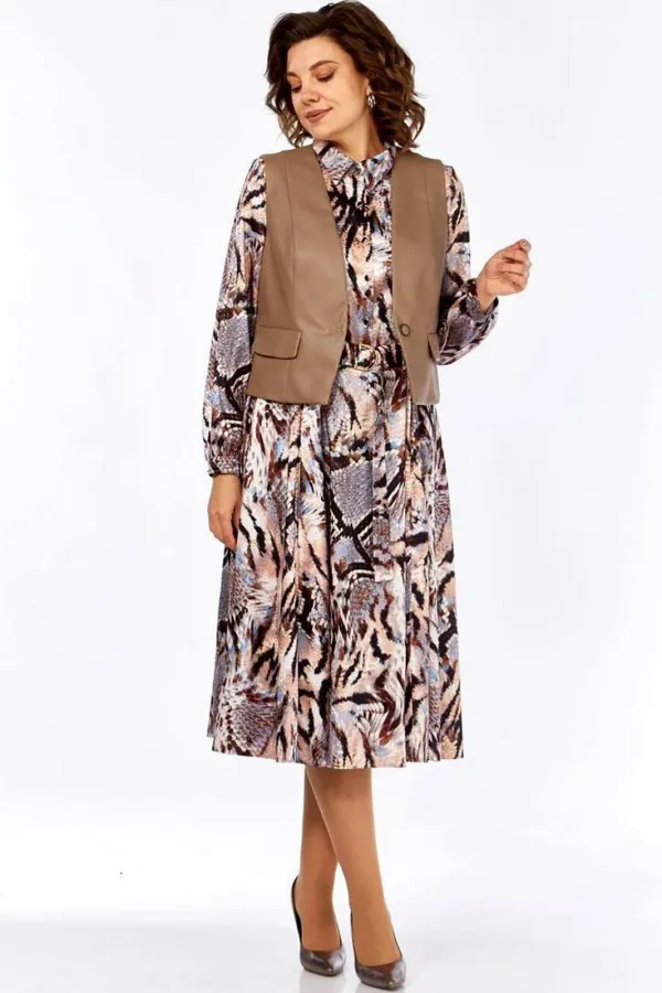 Комплект женский, состоящий из платья и жилета. Платье свободного силуэта, шифоновое, полностью на подкладке. Рукав втачной, снизу собран на манжету, манжета застегивается на петлю и пуговицу. По талии платье отрезное, спереди до талии планка на петли и пуговицы и нагрудные вытачки, которые позволяют создать идеальную посадку по груди. Юбка-шестиклинка. Дополнительно в комплекте к платью присутствует пояс из основной ткани. Жилет полуприлегающего силуэта из эко-кожи, с накладными декоративными клапанами, застежка на одну петлю и пуговицу.
