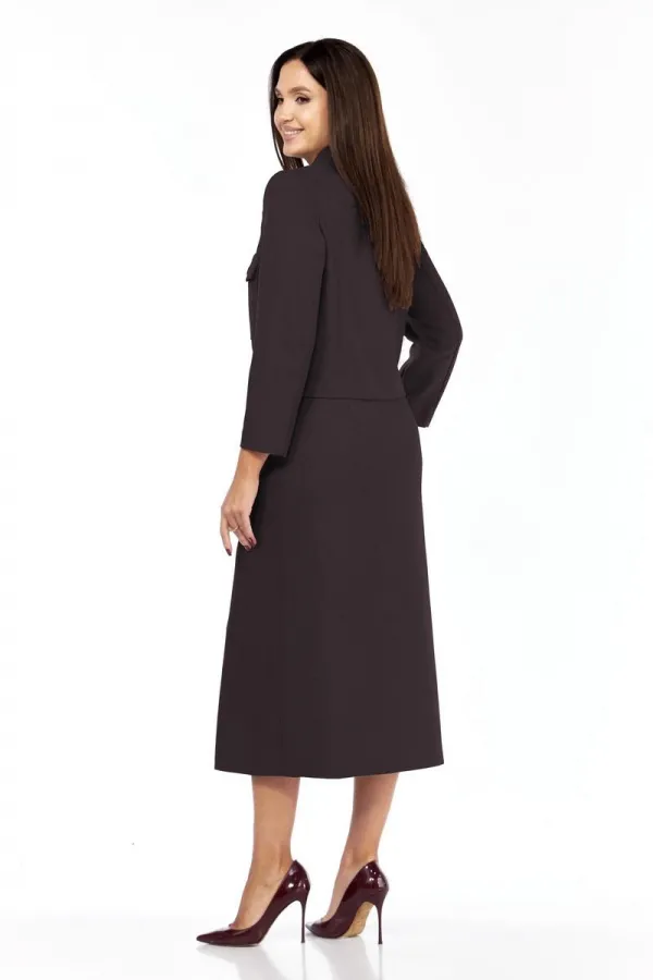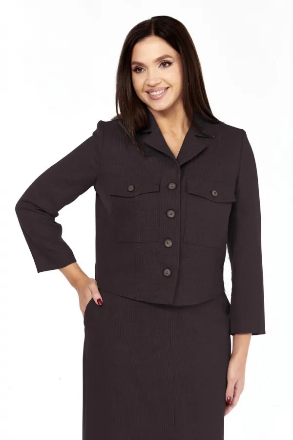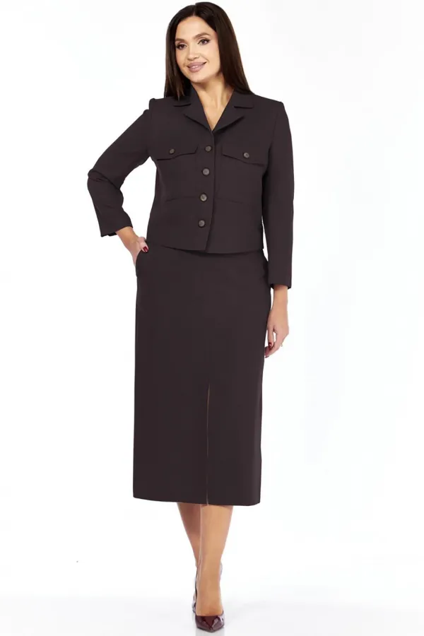Костюм женский состоящий из жакета и юбки. Жакет приталенного силуэта на подкладке спереди, со втачным рукавом длины ¾. Имеет отложной воротник с лацканами, по переду застежка на петли и пуговицы, на груди накладные карманы с клапанами, которые застегиваются на петлю и пуговицу.