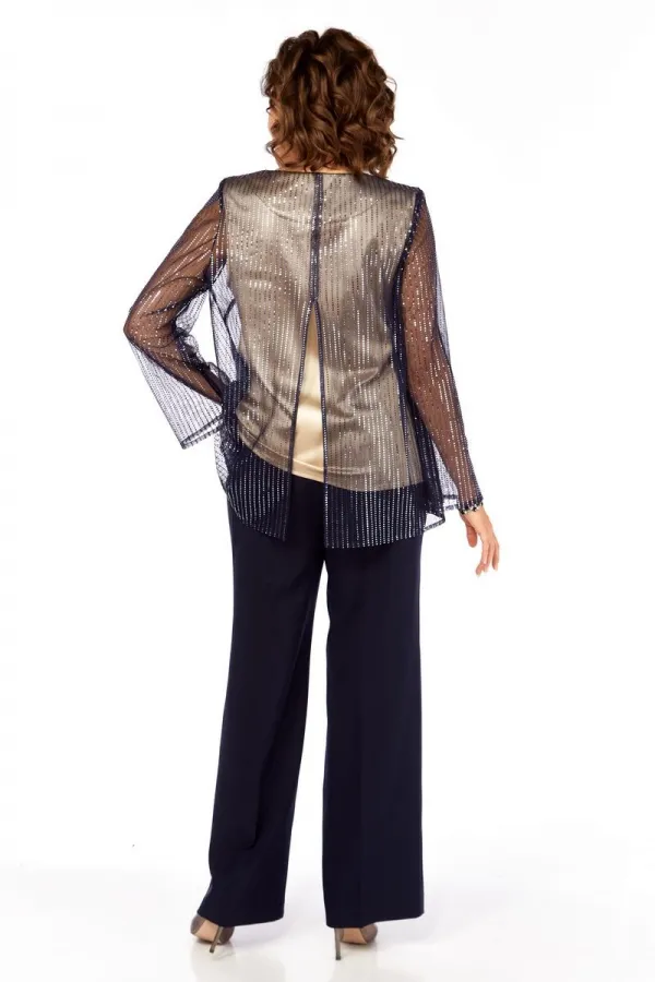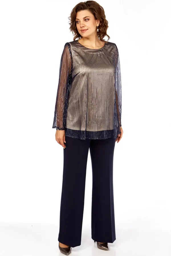Костюм праздничный брючный. Состоит из блузы и брюк. Блуза двухслойная. Горловина округлая, вытачки по груди, рукава верхнего слоя втачные, на спинке шов в котором обработан разрез. Брюки прямого силуэта, со стрелками, пояс притачной по талии на резинке от бокового шва, с застежкой на тесьму-молнию и пуговицу, по переду имеются действующие карманы-хулиганы.