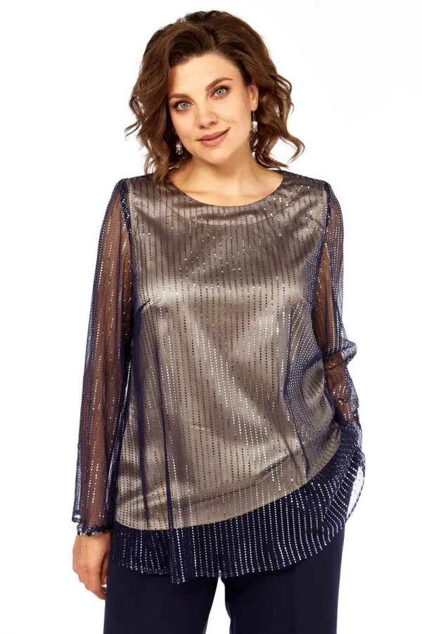 Костюм праздничный брючный. Состоит из блузы и брюк. Блуза двухслойная. Горловина округлая, вытачки по груди, рукава верхнего слоя втачные, на спинке шов в котором обработан разрез. Брюки прямого силуэта, со стрелками, п... Читать далее...
