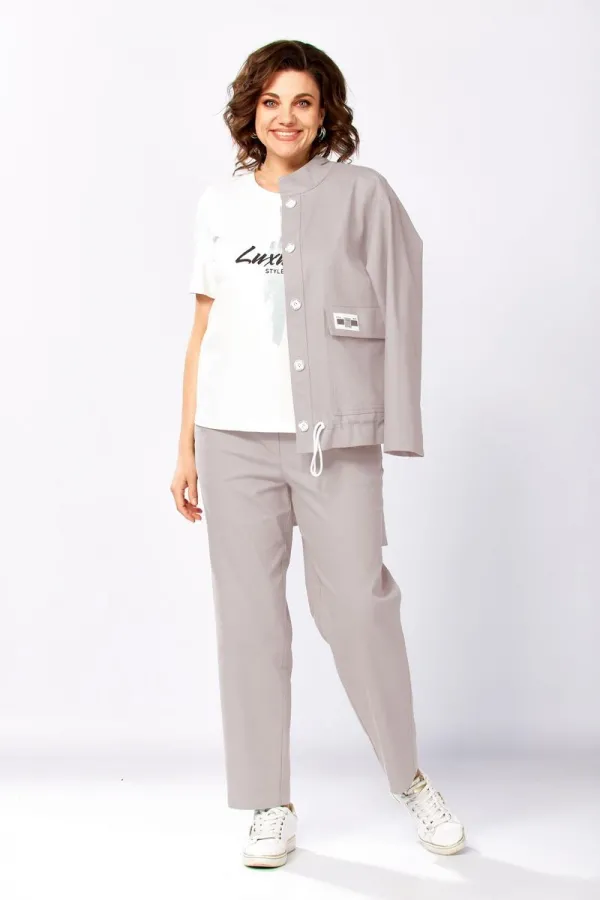 Костюм-тройка состоящий из бомбера, топа и брюк. Бомбер свободного силуэта, вырез горловины округлый, воротник - стойка, рукав спущенный. Застежка спереди на петли и пуговицы. По переду накладные карманы, по спинке - дек... Читать далее...
