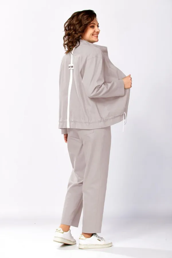 Костюм-тройка состоящий из бомбера, топа и брюк. Бомбер свободного силуэта, вырез горловины округлый, воротник - стойка, рукав спущенный. Застежка спереди на петли и пуговицы. По переду накладные карманы, по спинке - декоративная вставка. Низ изделия на кулисе. Топ полуприлегающего силуэта, вырез горловины округлый, рукав втачной. Брюки-бананы без застежки. Талия на резинке, в боковых швах - карманы.