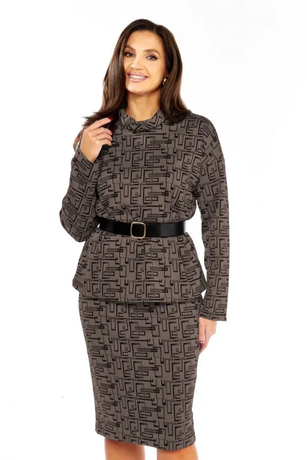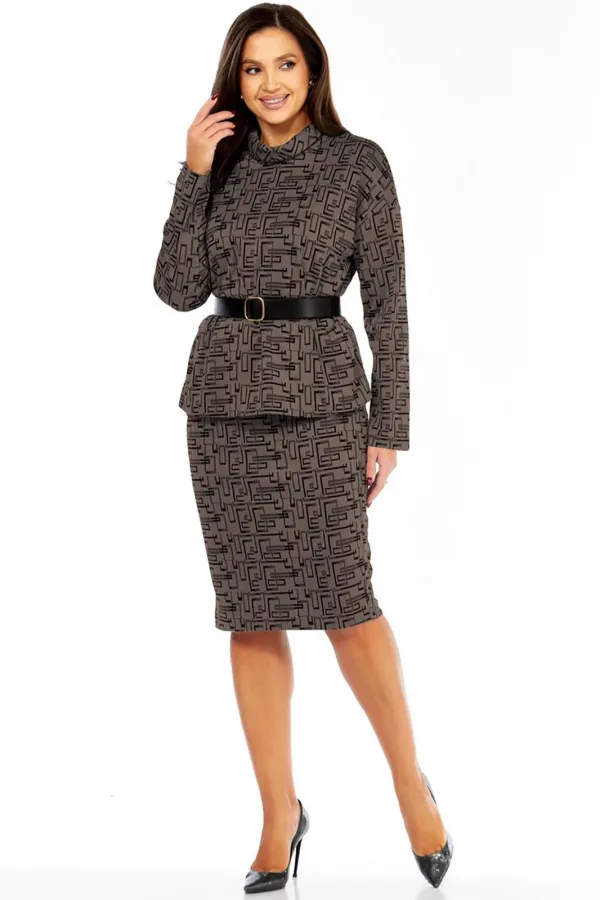 Костюм женский, состоящий из джемпера и юбки. Джемпер свободного силуэта, со спущенным рукавом. Воротник-хомут. Юбка прямая, по талии на резинке, без застежки. В комплекте-ремень.
