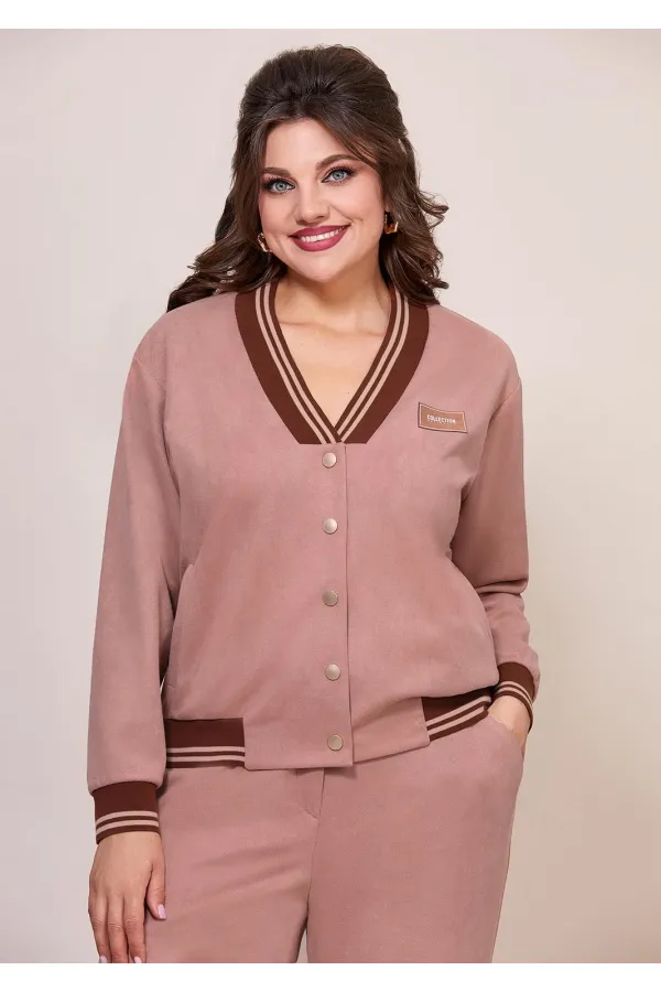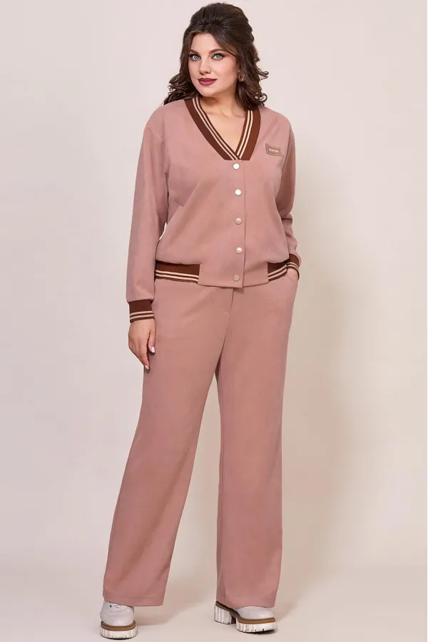 Женский комплект, состоит из бомбера и брюк, свободного покроя, выполнен из трикотажного полотна с эффектом «штрукс». Бомбер свободного покроя, с застежкой по переду на кнопки, горловина V-образной формы, отделана довязом контрастного цвета. Также на полочке обработаны прорезные карманы с листочкой, по низу бомбера втачен довяз контрастного цвета. Рукав втачной, длинный, из основной ткани, по низу на манжете. Брюки прямого покроя, на притачном поясе, выполнены из трикотажного полотна с эффектом «штрукс». Застежка по переду на молнию, также по переду брюк обработаны карманы в боковых швах, на заднем полотнище брюк обработана кокетка. Стильный и удобный комплект в спортивном стиле то, что нужно на каждый день!