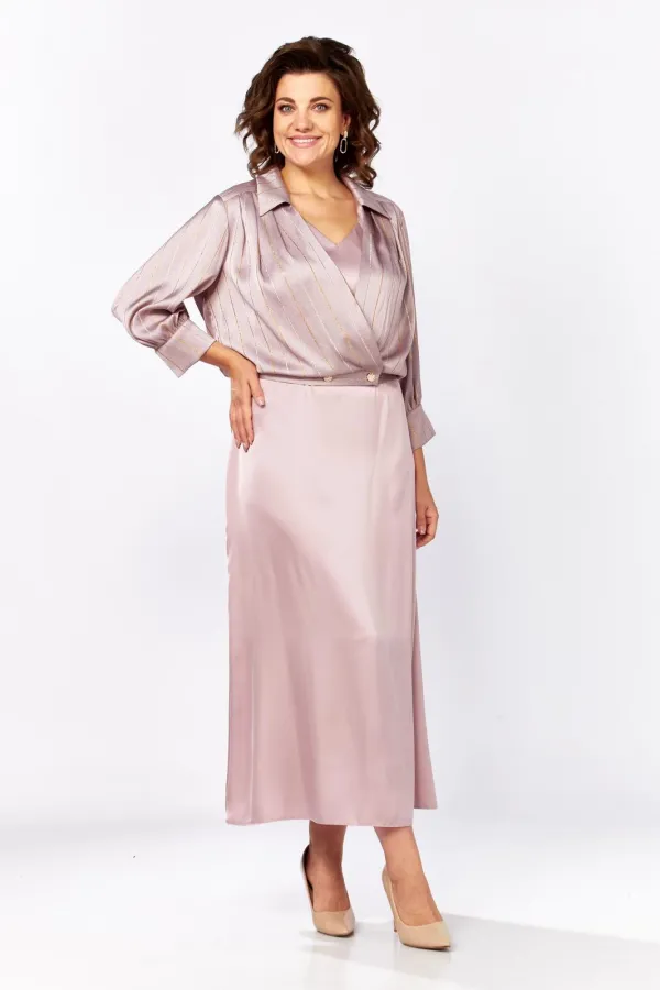 Женский комплект, состоит из платья и блузы, выполнен из однотонного атласа и атласа в полоску. Платье с V-образной горловиной, на обтачке, по переду обработаны нагрудные вытачки. Спинка со средним швом и вытачками, рукав цельнокроеный, немного спущенный по линии плеча. Блуза свободного покроя, из атласа в полоску, по линии талии с притачным поясом из атласа в полоску. По спинке в пояс вставлена резинка для удобства регулировки на любой тип фигуры, горловина на обтачке, обработана воротником. Лиф платья с кокеткой по линии плеча, от линии кокетки заложены складки, по низу лиф присборен на пос. Спинка также свободного покроя, присборена по низу на пояс. Рукав втачной, длиной 3/4, по низу присборен на широкий манжет, на манжете застежка на петлю-пуговицу. Эффектный и стильный комплект выполненный в трендовых расцветках сделает ваш образ элегантным на любом мероприятии!