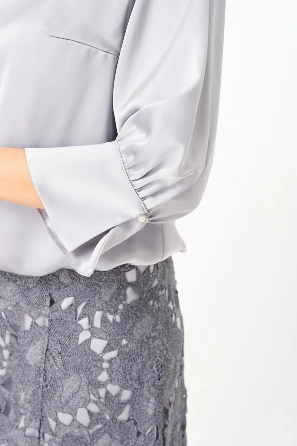Эффектный комплект, состоит из блузы и юбки. Блузка выполнена из атласной ткани, свободного покроя, горловина округлой формы, обработана воротником-шалью с застежкой по спинке на петлю-пуговицу. На полочке выполнены вытачки, по низу блуза на резинке, спинка идентична полочке, по низу на резинке. Рукав втачной, свободного покроя, присборен по низу на манжет с разрезом и декорированным пуговицей. Юбка выполнена из кружева, на подкладке, расклешенная к низу. На переднем и заднем полотнище выполнены клинья, на заднем полотнище, в среднем шве потайная молния, верхний срез на обтачке. Элегантный комплект отличный выбор для вас на любое мероприятие!