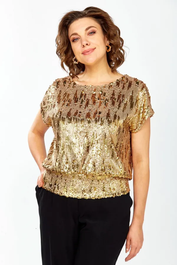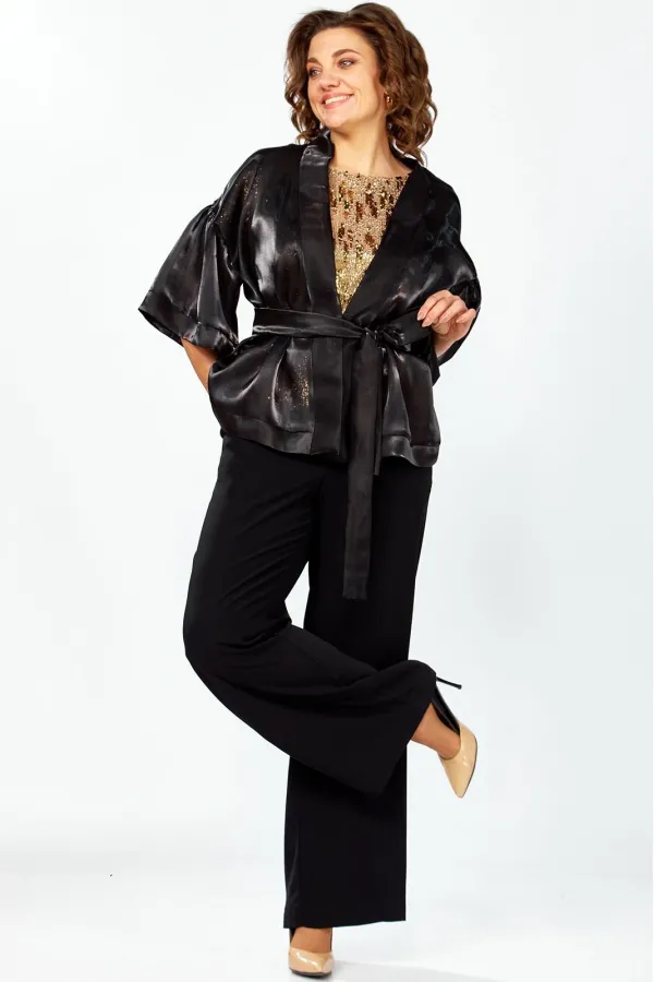 Женский комплект, состоит из блузы, брюк и накидки. Блуза свободного покроя, выполнена из ткани в пайетки, горловина округлой формы, рукав цельнокроенный, по низу на притачной планке. Брюки свободного покроя, выполнены из текстиля, верхний срез обработан притачным поясом. Застежка по переду на молнию-пуговицу, в боковых швах карманы. Накидка выполнена из органзы, свободного покроя, горловина обработана притачной планкой. Рукав спущенный, присборен по окату, по линии талии завязывается пояс из органзы. Эффектный, многофункциональный костюм отличный выбор для вашего образа!