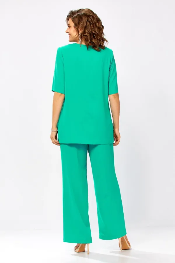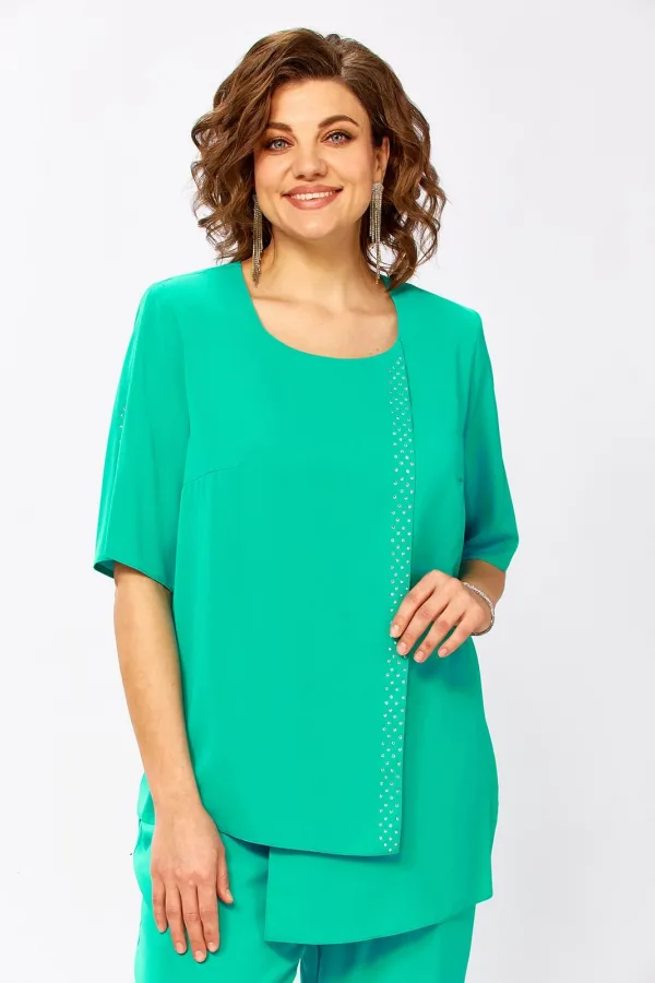 Вечерний брючный костюм больших размеров, состоящий из свободной блузки и классических брюк. Этот брючный, вечерний костюм подходит для женщин, которые ищут удобную и стильную одежду для свадьбы, на юбилей, на выпускной, на торжество, на корпоратив. Выполнен из текстиля, блуза свободного покроя, горловина округлой форме обтачке. По переду выполнены вертикальные подрезы, один край декорирован стразами, вертикальные линии прекрасно вытягивает силуэт и делает фигуру изящнее. Рукав втачной, оптимальной длины. Брюки с высокой посадкой визуально стройнят фигуру и идеально подходят для полных женщин. Верхний срез обработан поясом на резинке. Яркость ткани добавляют наряду для женщин праздничный вид, а весенние оттенки создадут праздничное настроение. Благодаря свободному крою, он обеспечит комфорт и свободу движений.