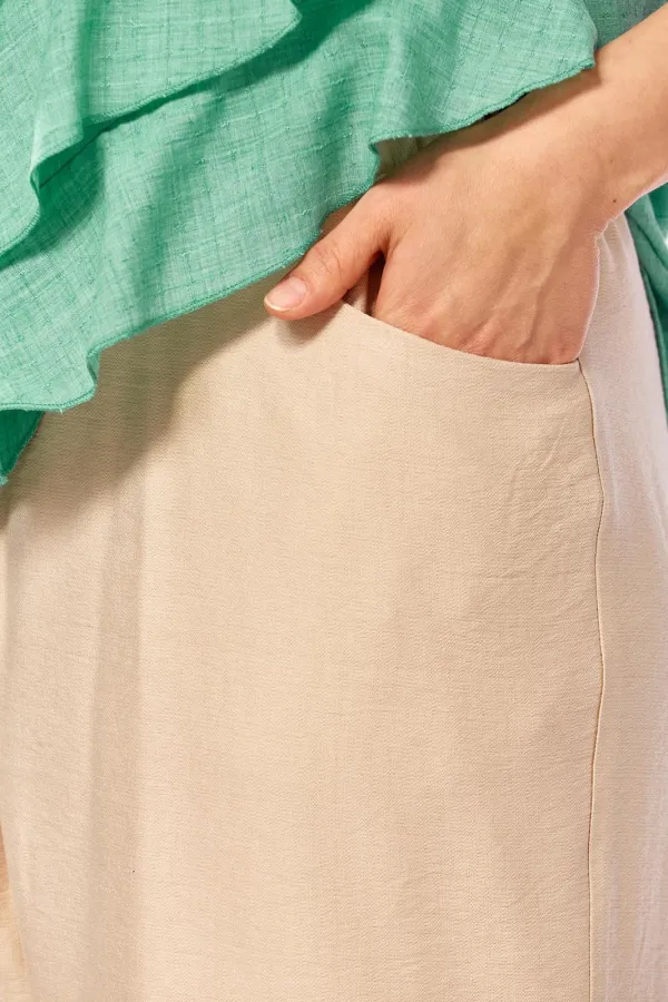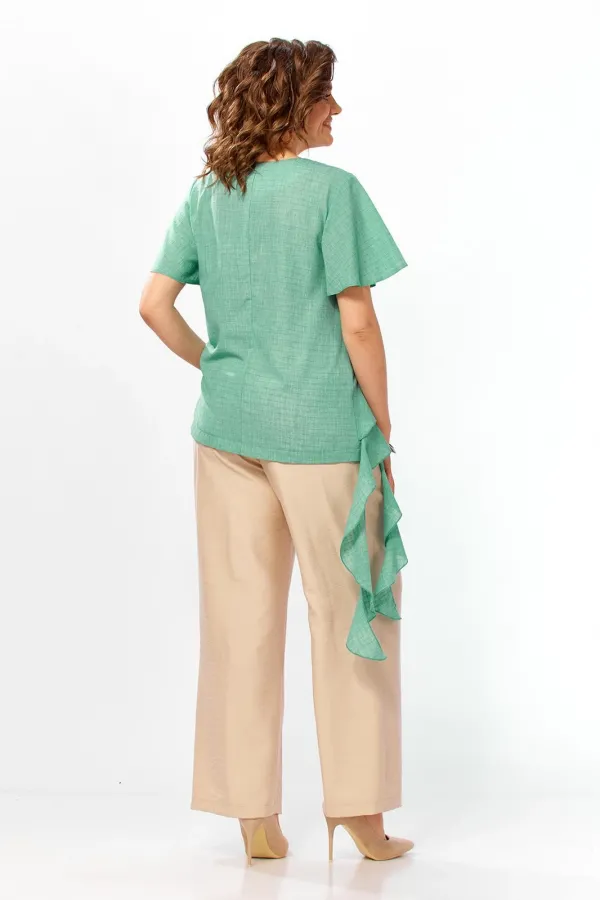 Стильный, женский комплект, состоит из брюк и блузы, выполнен из облегченного льна вишера (брюки) и хлопковой ткани (блуза). Блуза свободного покроя, горловина V-образной формы, на обтачке. По переду выполнены ассиметричные подрезы с вставками воланов из хлопковой ткани, которые романтично свисают по одной стороне, со второй стороны, в боковом шве, выполнен разрез. Рукав втачной, оптимальной длины, расклешенный к низу. Спинка свободного покроя, из основной ткани. Брюки свободного покроя, выполнены из основной ткани, льна-вишера, верхний срез обработан притачным поясом, с вставками резинки. Застежка на молнию и петлю-пуговицу, в боковых швах обработаны карманы. Комплект легкий, выполнен из тканей с натуральными нитями в составе, отличный выбор для жарких, летних дней!