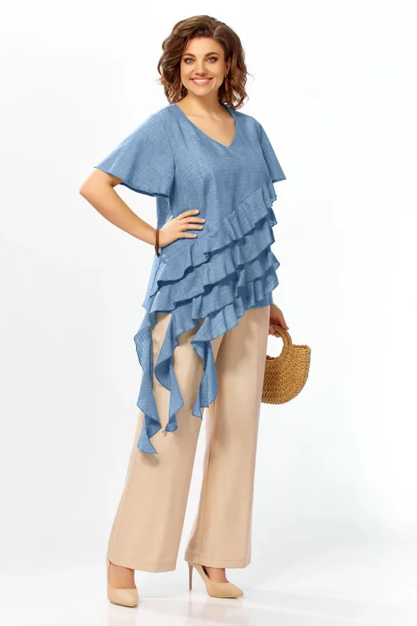 Стильный, женский комплект, состоит из брюк и блузы, выполнен из облегченного льна вишера (брюки) и хлопковой ткани (блуза). Блуза свободного покроя, горловина V-образной формы, на обтачке. По переду выполнены ассиметричные подрезы с вставками воланов из хлопковой ткани, которые романтично свисают по одной стороне, со второй стороны, в боковом шве, выполнен разрез. Рукав втачной, оптимальной длины, расклешенный к низу. Спинка свободного покроя, из основной ткани. Брюки свободного покроя, выполнены из основной ткани, льна-вишера, верхний срез обработан притачным поясом, с вставками резинки. Застежка на молнию и петлю-пуговицу, в боковых швах обработаны карманы. Комплект легкий, выполнен из тканей с натуральными нитями в составе, отличный выбор для жарких, летних дней!