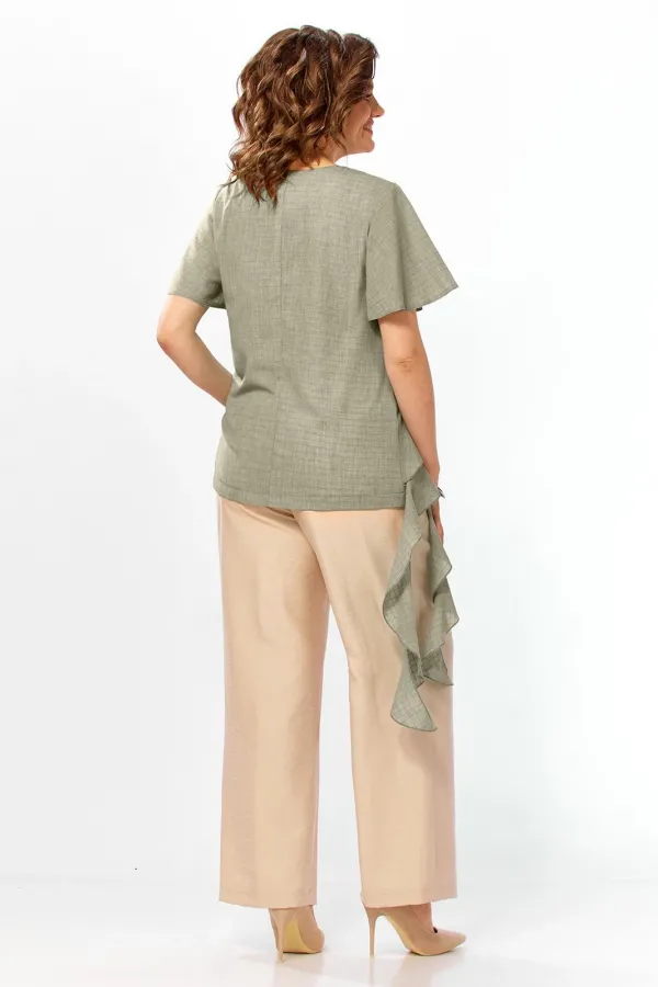 Стильный, женский комплект, состоит из брюк и блузы, выполнен из облегченного льна вишера (брюки) и хлопковой ткани (блуза). Блуза свободного покроя, горловина V-образной формы, на обтачке. По переду выполнены ассиметричные подрезы с вставками воланов из хлопковой ткани, которые романтично свисают по одной стороне, со второй стороны, в боковом шве, выполнен разрез. Рукав втачной, оптимальной длины, расклешенный к низу. Спинка свободного покроя, из основной ткани. Брюки свободного покроя, выполнены из основной ткани, льна-вишера, верхний срез обработан притачным поясом, с вставками резинки. Застежка на молнию и петлю-пуговицу, в боковых швах обработаны карманы. Комплект легкий, выполнен из тканей с натуральными нитями в составе, отличный выбор для жарких, летних дней!