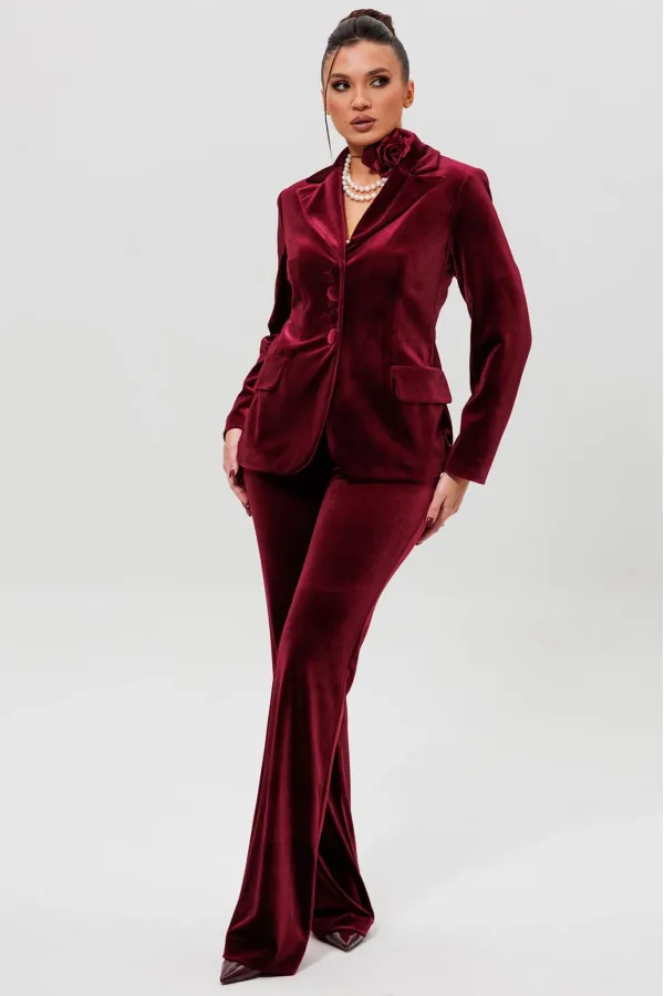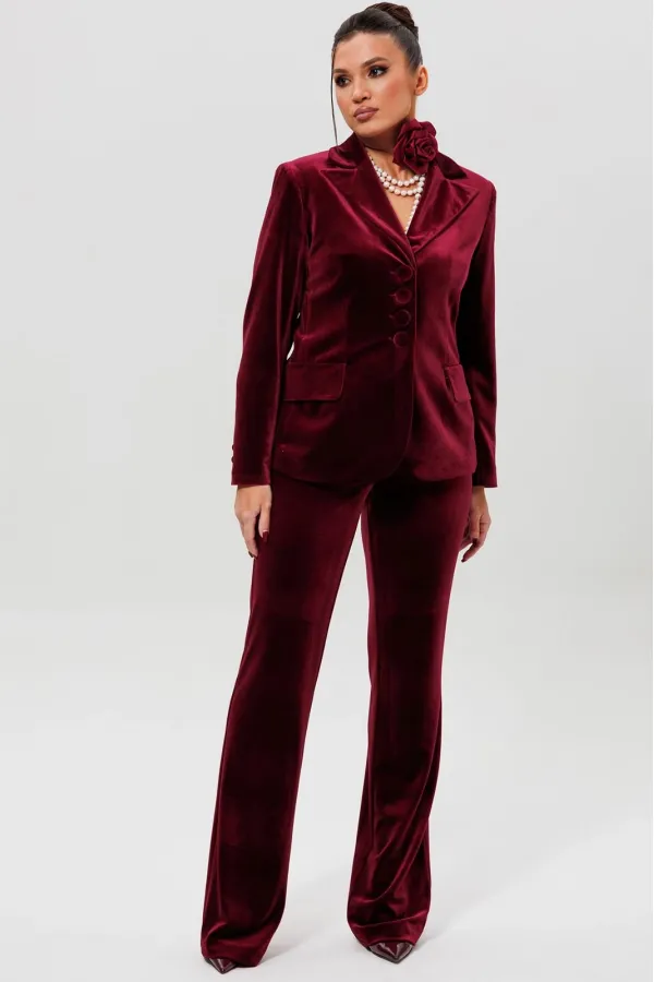 Встретьте Новый год в безупречном образе с этим роскошным бордовым бархатным костюмом. Модель состоит из полуприлегающего жакета на подкладке и эффектных брюк, которые плавно расклешены к низу, создавая женственный и динамичный силуэт. Жакет с отложным воротником и декоративными пуговицами на рукавах подчеркивает стройность фигуры. Его можно носить отдельно с джинсами или юбками, делая образ универсальным. Брюки с притачным поясом удобно сидят по фигуре. Этот праздничный костюм бордового цвета — идеальный выбор для главной ночи года, который подарит вам уверенность и комфорт.