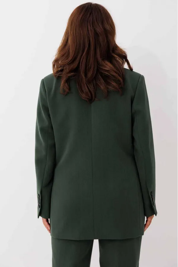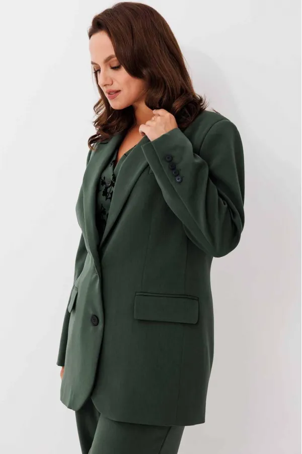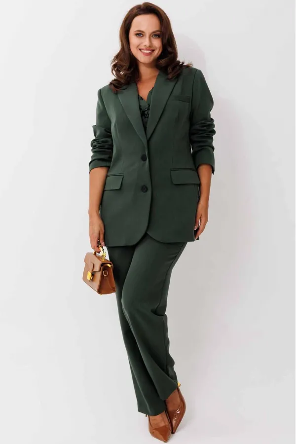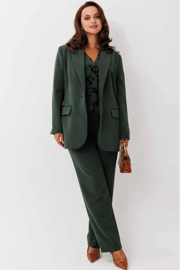Элегантный женский костюм, состоящий из жакета и прямых брюк, выполнен из костюмной однотонной ткани. Жакет однобортный, на петлях и пуговицах, с английским воротником и клапанами по бокам. Рукав втачной, длина — полная. Посадка свободная, что обеспечивает комфорт и стильный силуэт. Брюки прямого кроя, на частичной резинке по поясу для удобной посадки и идеального прилегания. Костюм на подкладке, лёгкий, приятный к телу и подходит как для повседневной носки, так и для офиса или торжественного выхода.