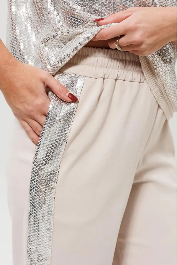 Серебристый костюм состоит из жакета с пайетками и брюк с декоративными лампасами. Этот роскошный серебристый костюм (Арт. 1277) создан для того, чтобы вы сияли на любом торжестве. Комплект включает в себя жакет и элегантные брюки с декоративными лампасами, которые зрительно вытягивают силуэт и добавляют образу строгости и шика. Особый шарм костюму придает цветок-брошь из той же ткани, которая может быть использована как на лацкане жакета, так и в прическе. Костюм с пайетками и лампасами — это готовое решение для новогодней ночи, свадьбы, выпускного вечера или любого события, где ваш образ должен быть безупречным. Размеры 48-54.