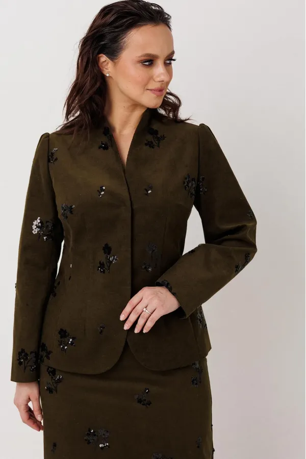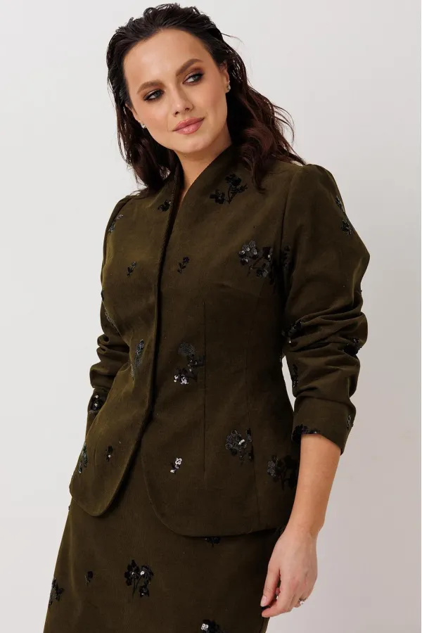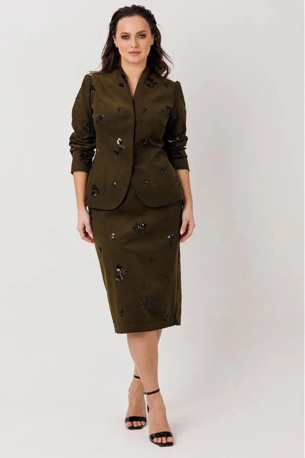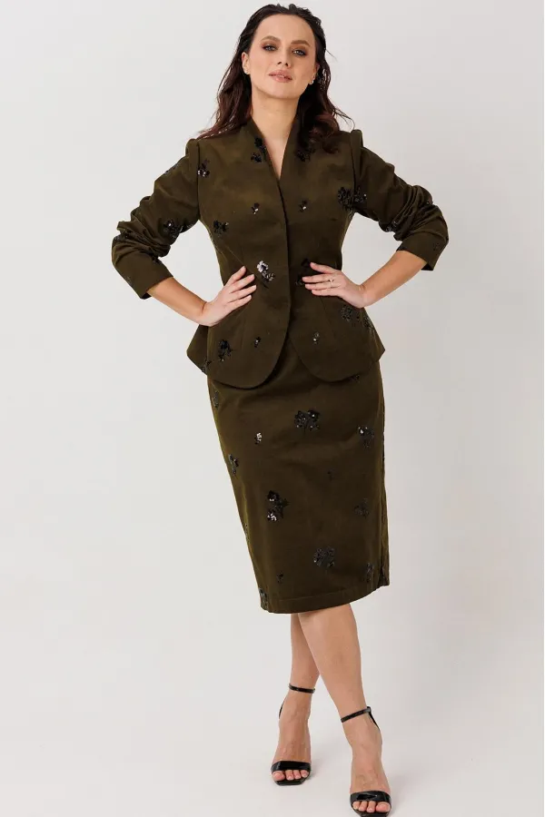 Элегантный костюм-двойка (жакет и юбка), выполненный из штруксовой ткани с декоративной вышивкой пайетками в виде цветочных мотивов, создающих эффект люминесценции при движении. Жакет на подкладке, с приталенным силуэтом застегивается на две потайные кнопки, обеспечивающие аккуратный внешний вид и скрытую застежку. Юбка-карандаш чуть ниже колена, с задней шлицей гарантирует свободу движений и подчеркивает строгий крой. Пояс юбки на обтачке, застежка на молнию, частичная резинка по талии. Задняя шлица юбки — функциональный элемент, обеспечивающий удобство при ходьбе и соответствующий стандартам костюмного кроя. Юба на подкладке.