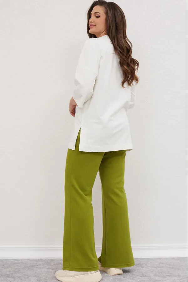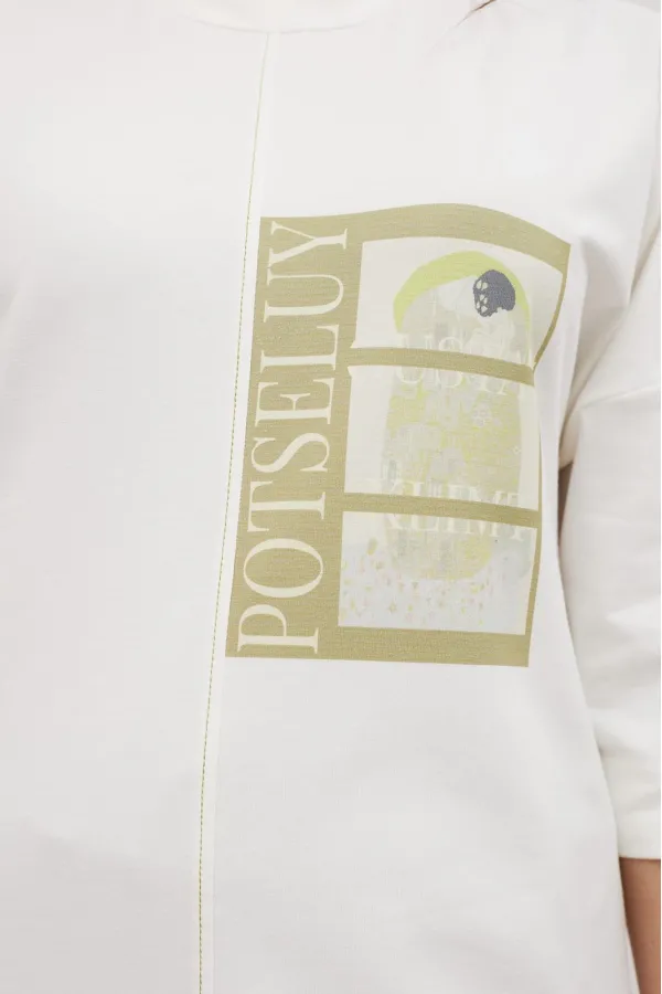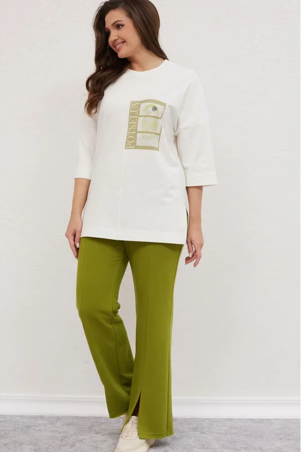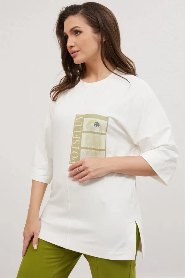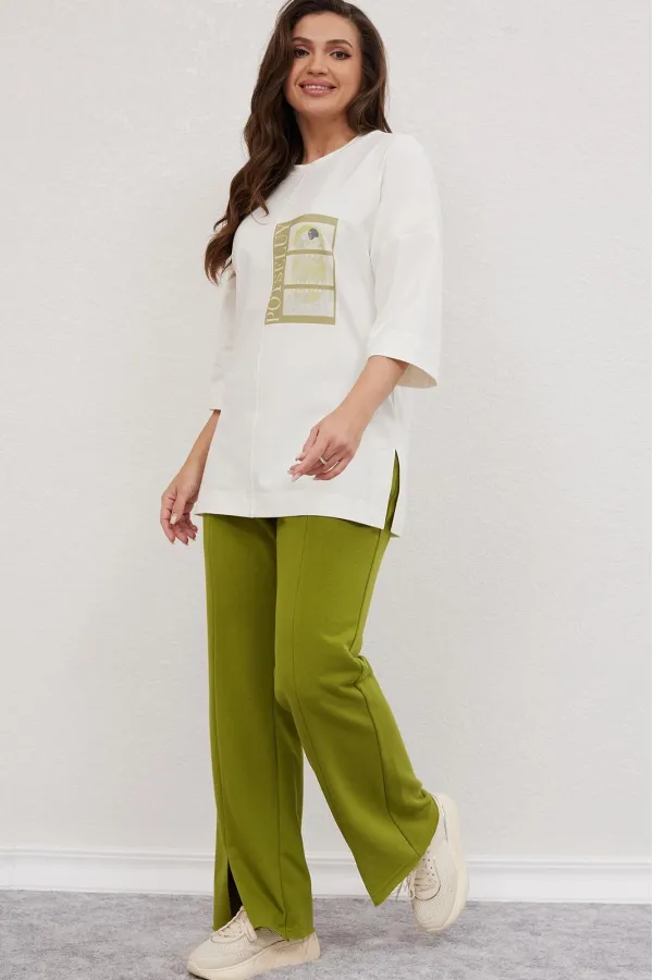 Комплект женский состоит из джемпера и брюк. Джемпер свободного силуэта со спущенными плечами выполнен из тонкого трикотажного полотна. Перёд с центральным швом и декоративной печатью. В боковых швах небольшие разрезы. Рукава одношовные втачные. Горловина круглая.