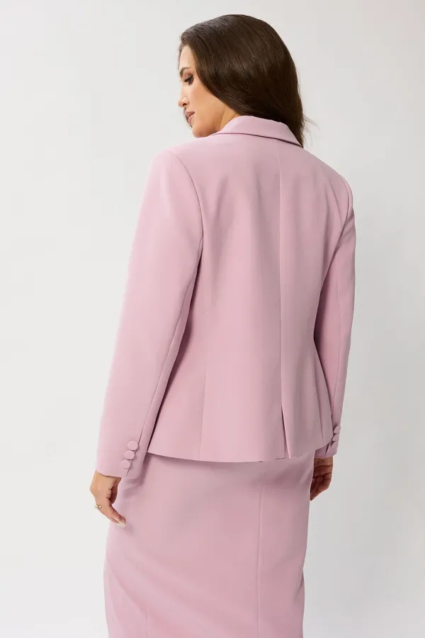 Элегантный женский костюм классического кроя. Комплект состоит из жакета и юбки-карандаш. Жакет полуприлегающего силуэта, спинка со средним швом, заканчивающимся шлицей. По конструкции предусмотрен воротник с лацканами. Застежка на две пуговицы. В передней части предусмотрены два прорезных кармана с листочкой. Рукава втачные, двухшовные, со шлицей на пуговицах. Юбка длиной миди, слегка зауженная к низу. Застежка на молнию в центральном шве. Юбка оснащена крупным декоративным элементом в виде объемных цветов, расположенных по вертикали слева. В левой боковой части юбки размещен разрез от колена до низа, что обеспечивает свободу движения и добавляет элегантности. Жакет и юбка на подкладке.