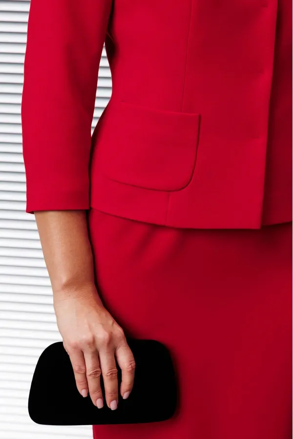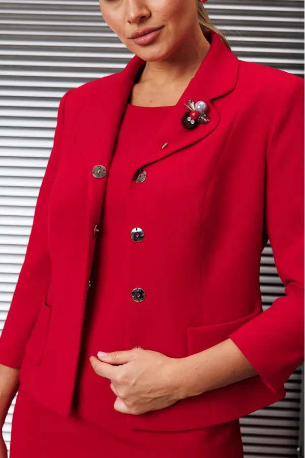 Костюм женский, состоящий из платья и жакета. Платье прилегающего силуэта. Спереди с рельефами, переходящими в вытачки. Спинка со средним швом, переходящим в шлицу. Рукав одношовный втачной. Горловина платья обработана подкройной обтачкой. Жакет прилегающего силуэта. По переду жакета рельефы, выходящие из проймы, и накладные карманы. Спинка со средним швом и рельефами. Застежка на декоративные кнопки.