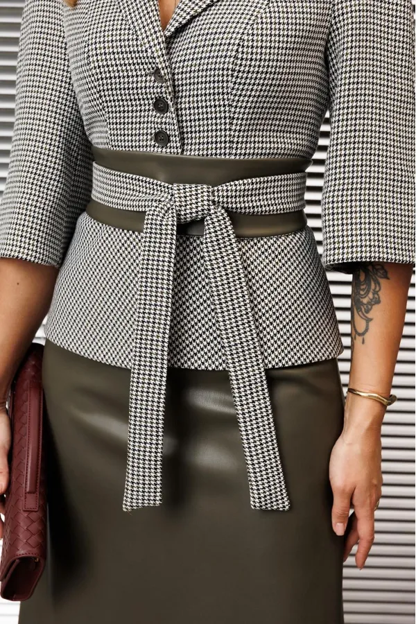 Бестселлер нашей коллекции - двухпредметный костюм, состоящий из жакета и юбки. Акцентом данного комплекта является съемный пояс. Для создания данного образа мы использовали мелкую клетку в тандеме с экокожей.Жакет приле... Читать далее...