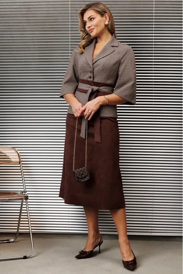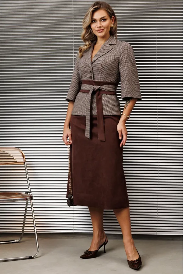 Бестселлер нашей коллекции - двухпредметный костюм, состоящий из жакета и юбки. Акцентом данного комплекта является съемный пояс. Для создания данного образа мы использовали мелкую клетку в тандеме с экокожей.Жакет прилегающего силуэта с отрезной баской по переду и спинка с рельефами. Рукав-реглан. Юбка А-силуэта на притачном поясе, сзади с резинкой. Застежка на тесьму-молнию в боковом шве. Костюм на подкладке.